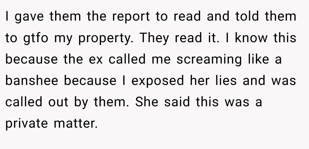 He emphasized that once the ex involved her family with lies, she forfeited any right to call the matter “private.”