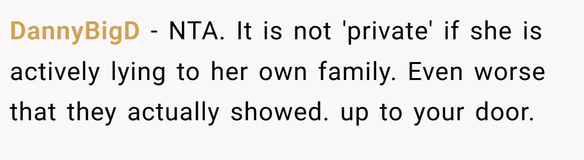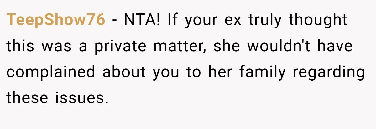 TeepShow76 pointed out the double standard: if the ex really believed this was a private matter, she wouldn’t have dragged her family into it first. By spreading a false narrative, she opened the door, and the dad simply responded with the truth. In this case, transparency trumped tact.