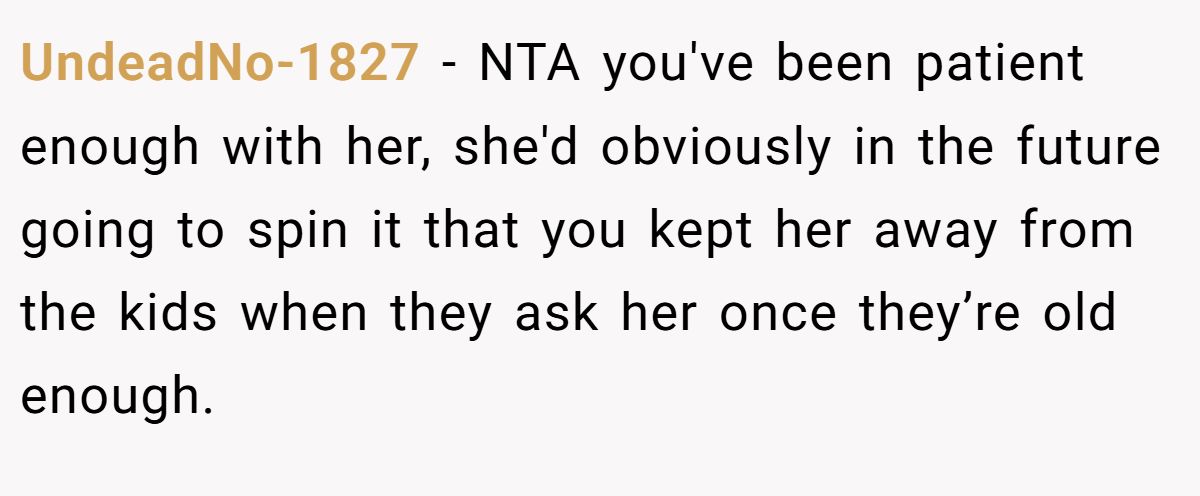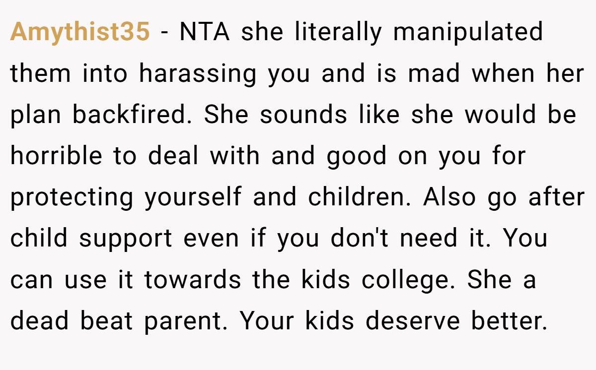 UndeadNo-1827 delivered a gut-punch of realism. The ex has already twisted the truth to her family, and it’s not a stretch to think she’ll do the same when her children start asking questions. By keeping records and staying consistent, this dad isn’t just defending himself, he’s safeguarding his kids from a future built on lies.