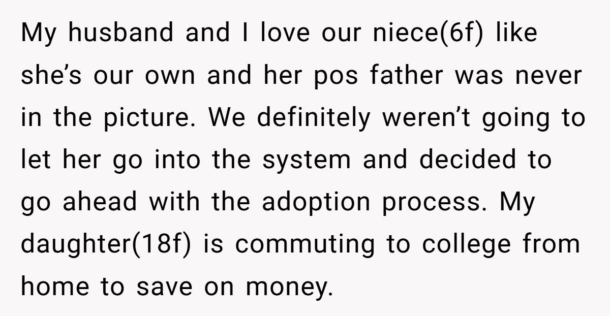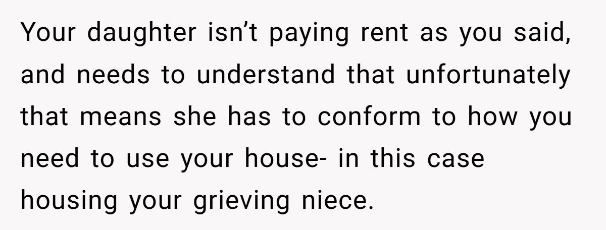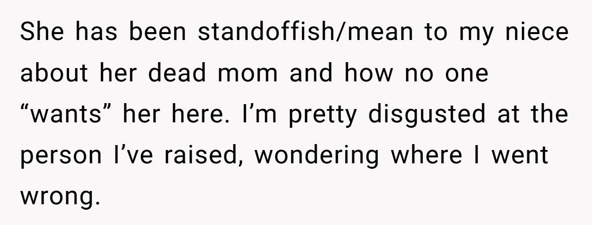 The mother saw herself as someone doing the right thing. She had just lost her sister. Her niece had lost everything. Offering the child a home wasn’t just a decision, it felt like a moral obligation. She believed her daughter, who had a roof over her head and her tuition paid, should show some compassion.