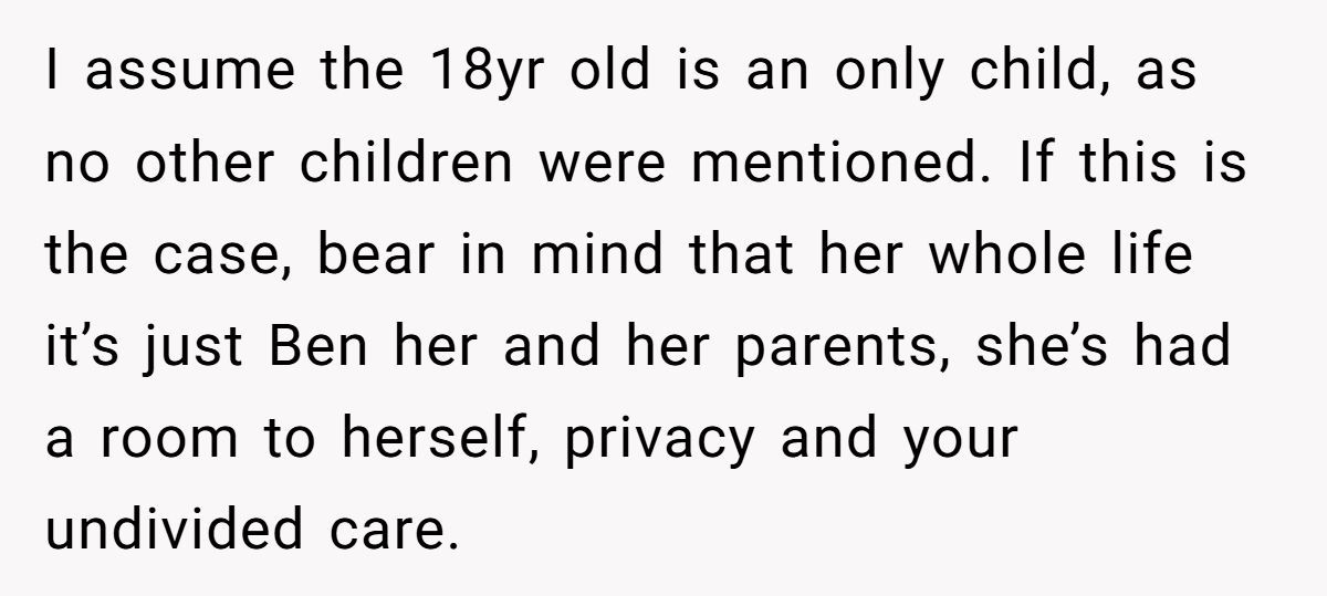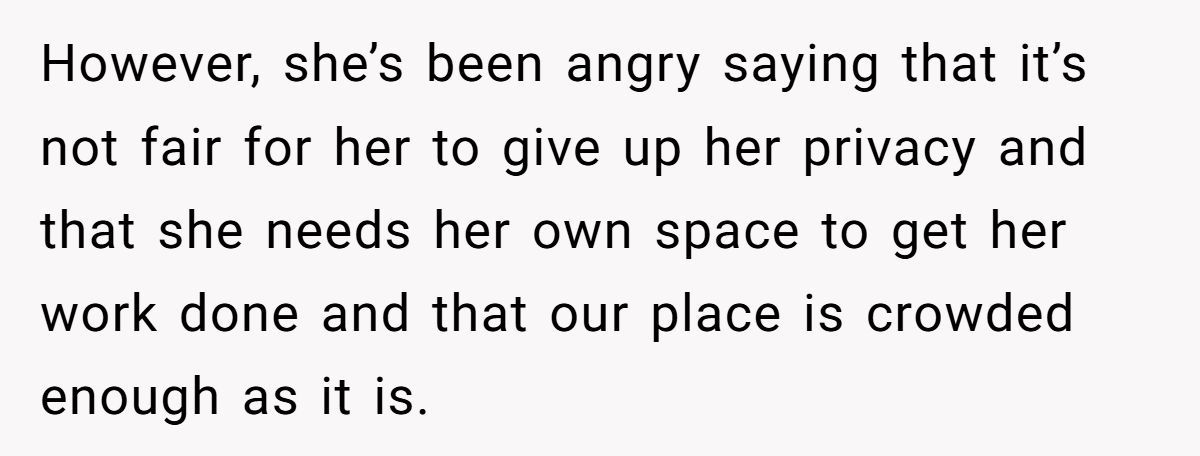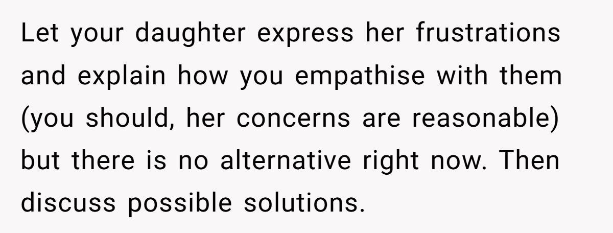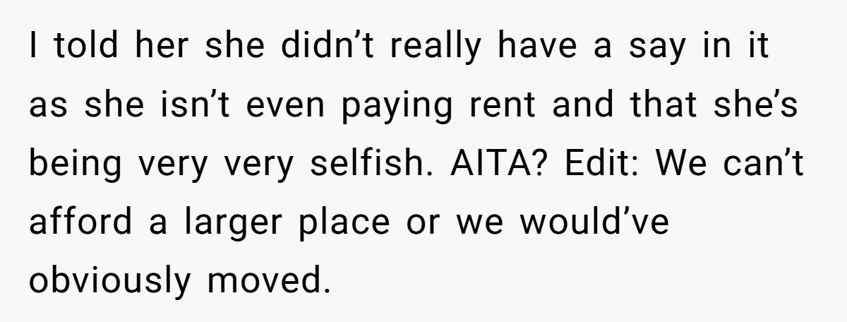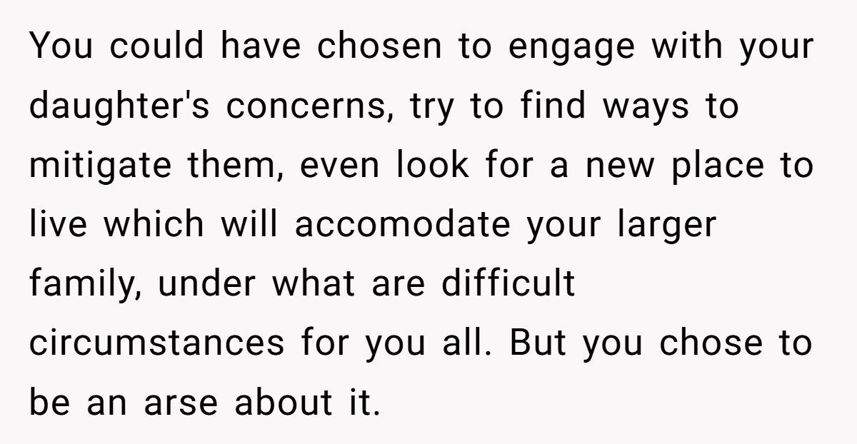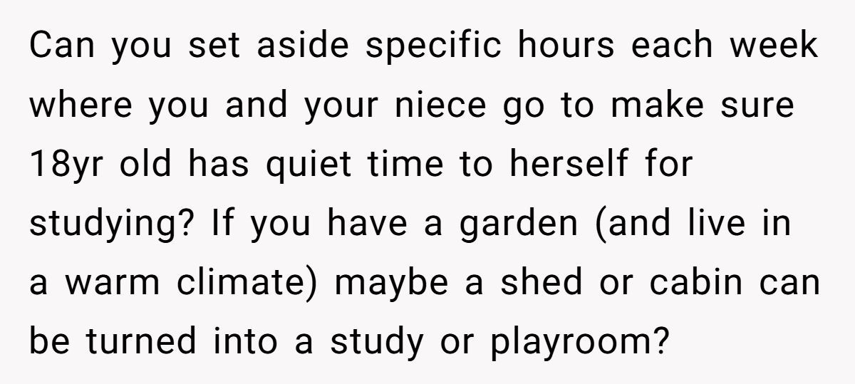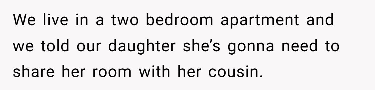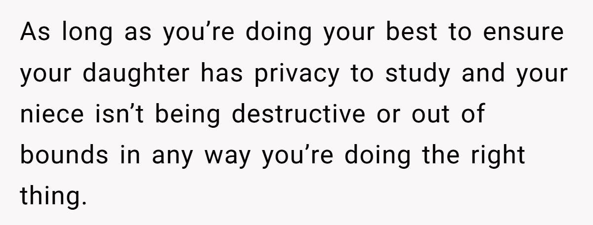 The mother could have acknowledged her daughter’s need for privacy without invalidating the niece’s need for care. Instead of an ultimatum, she could’ve created compromises. A curtain to separate the room. Scheduled alone time. Even looking into low-cost programs for larger apartments.