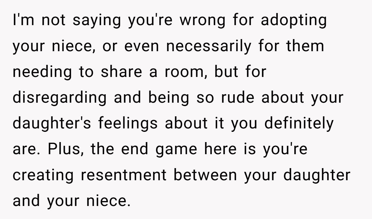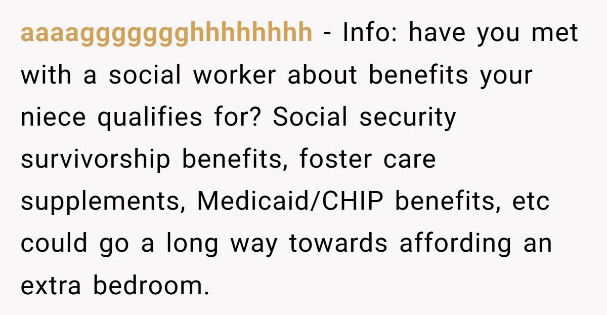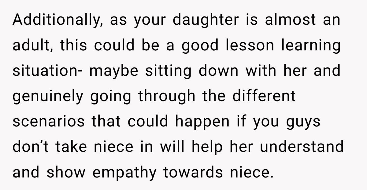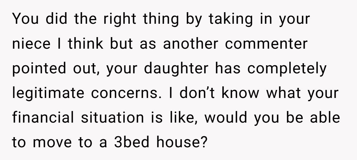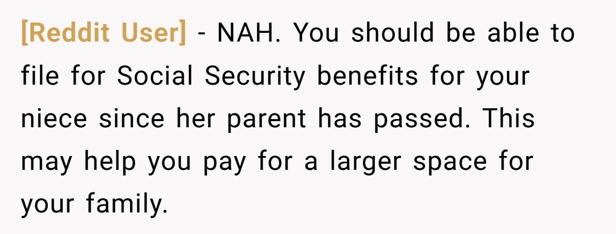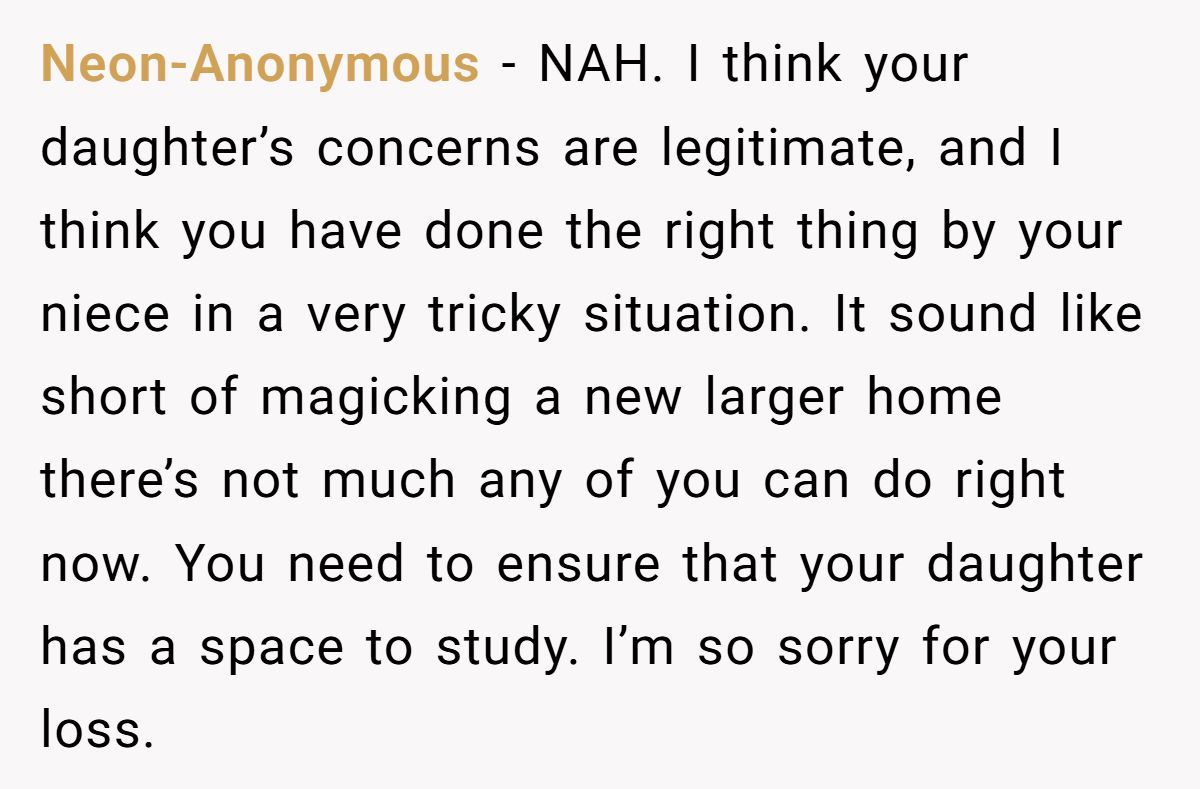 Meanwhile, others said NAH. They praised taking in the niece and suggested applying for benefits or finding ways to give the older daughter more privacy.