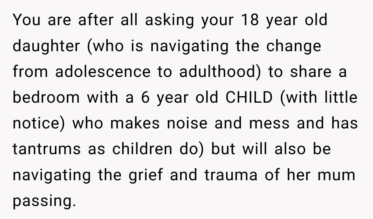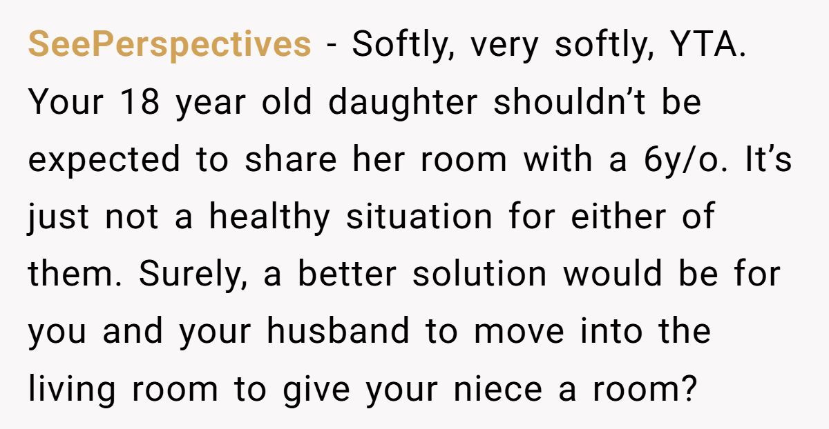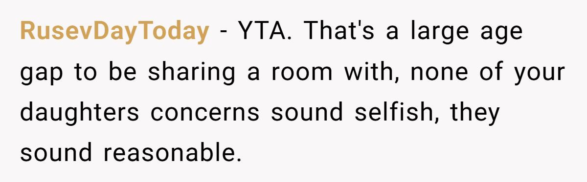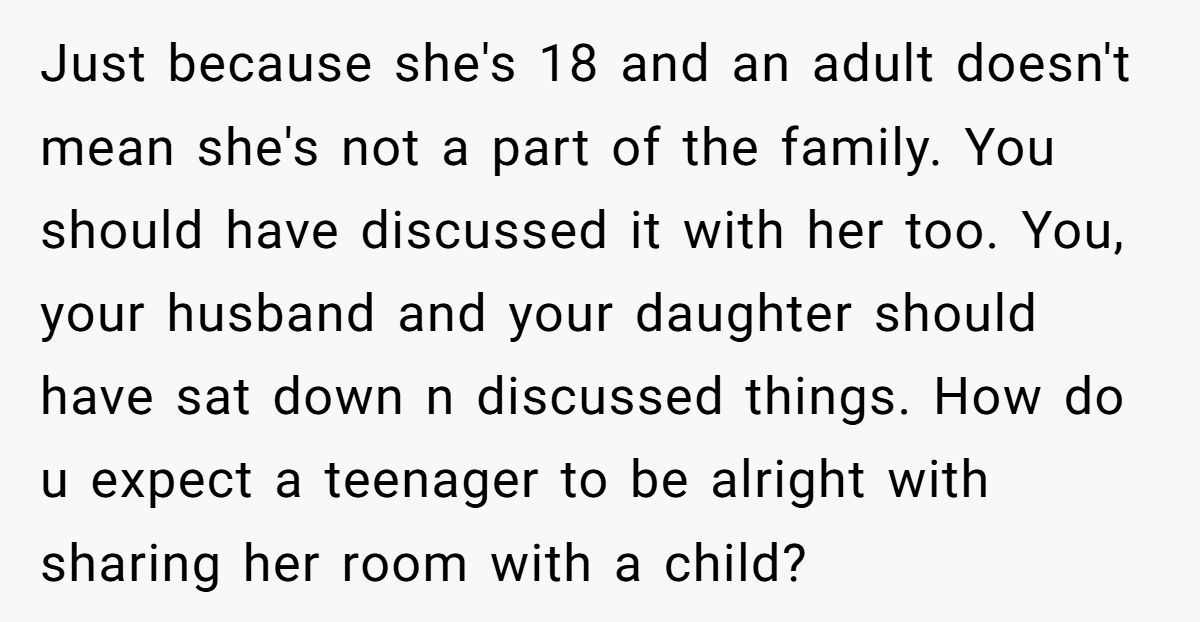 Some called OP the AH, saying she ignored her teen daughter’s valid concerns. They felt an 18-year-old shouldn’t be forced to share a room with a 6-year-old without a real discussion, and warned this could cause resentment.