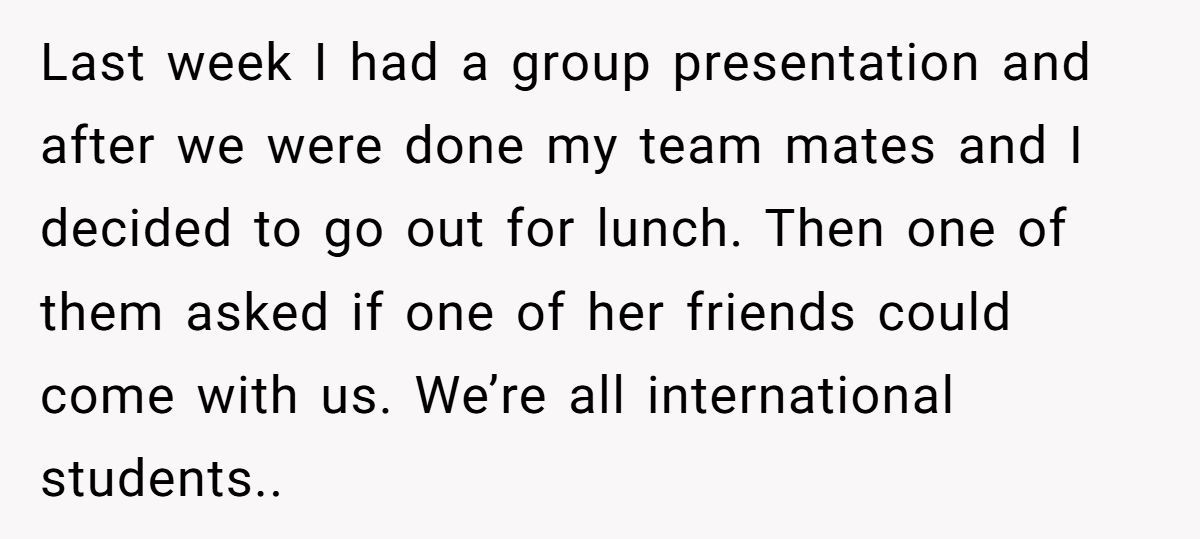 The Redditor, a Korean-Swiss student attending university abroad, had just wrapped up a team presentation and joined a celebratory lunch with classmates. One teammate brought along a friend, not part of the group, but joining in for the food and chatter.