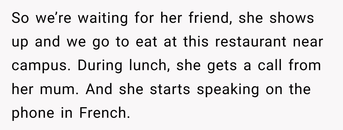 What started as a celebratory team lunch quickly unraveled into a messy cultural standoff. One international student thought she was just enjoying a post-presentation meal with classmates. But when a teammate’s friend decided to air her petty complaints in French, assuming no one around her understood, the vibe took a hard left.