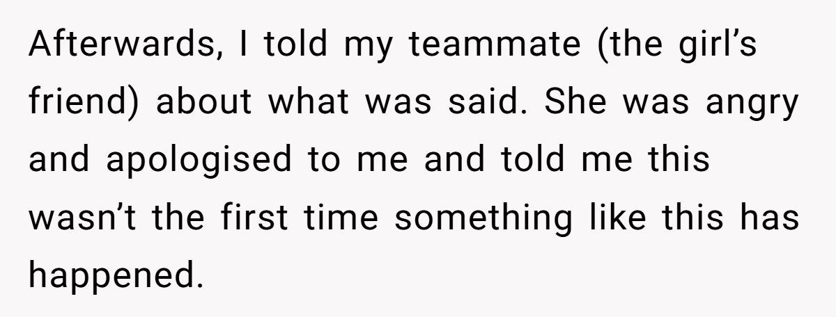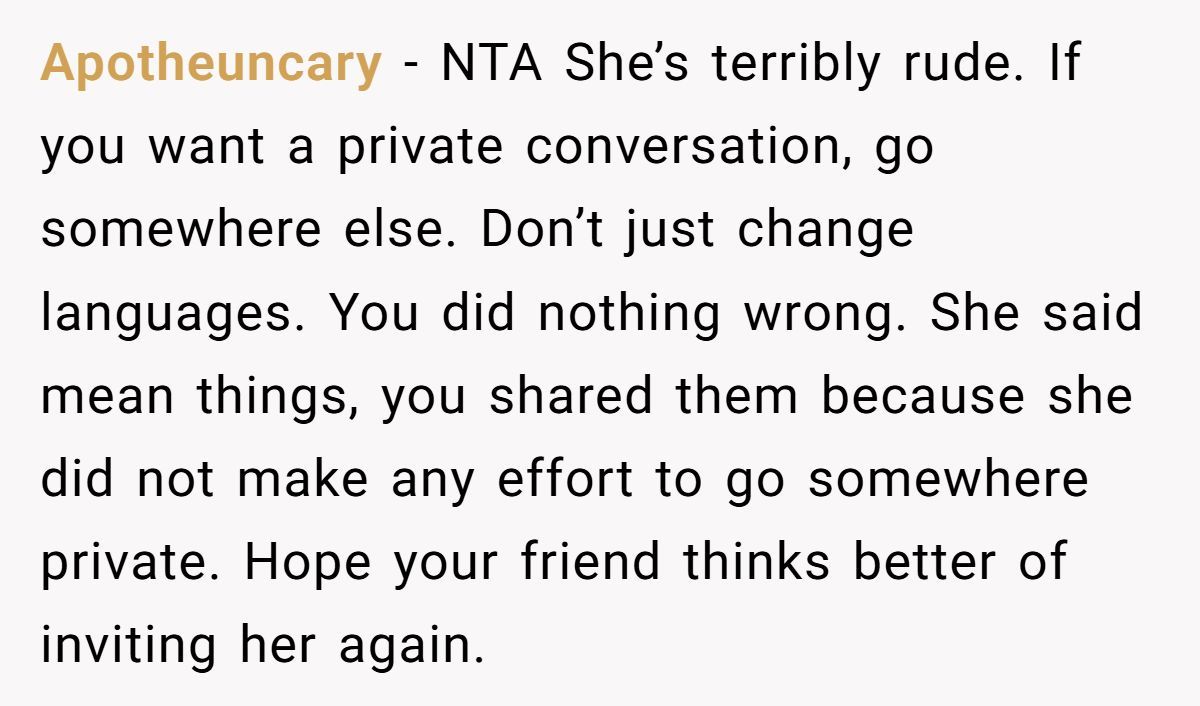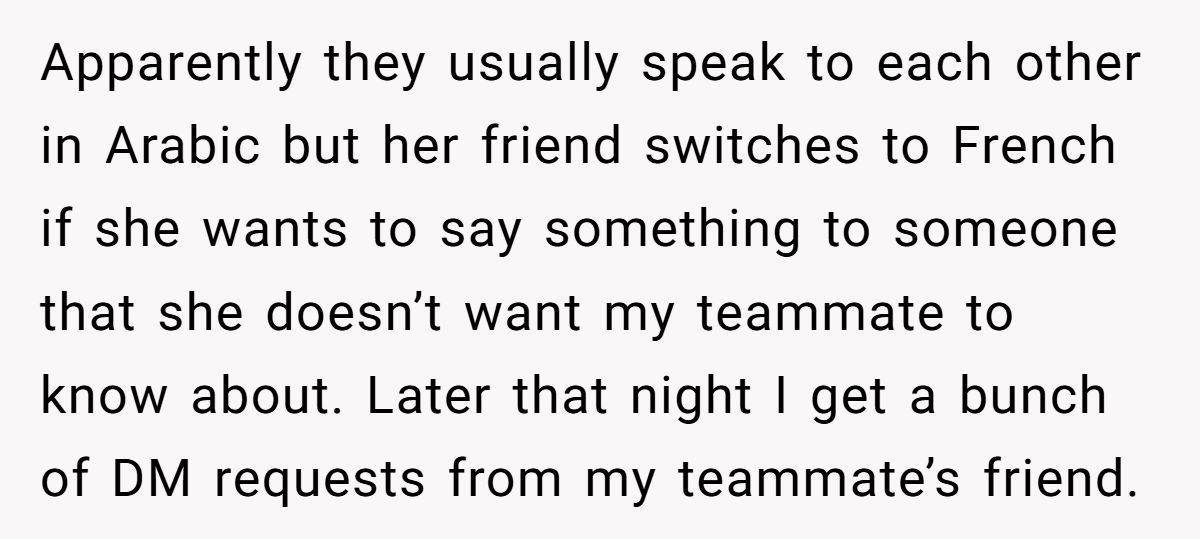 She didn’t call the friend out directly. Instead, she told her teammate what happened. The teammate was mortified and admitted this wasn’t the first time the friend had made shady remarks in other languages, assuming no one could understand.