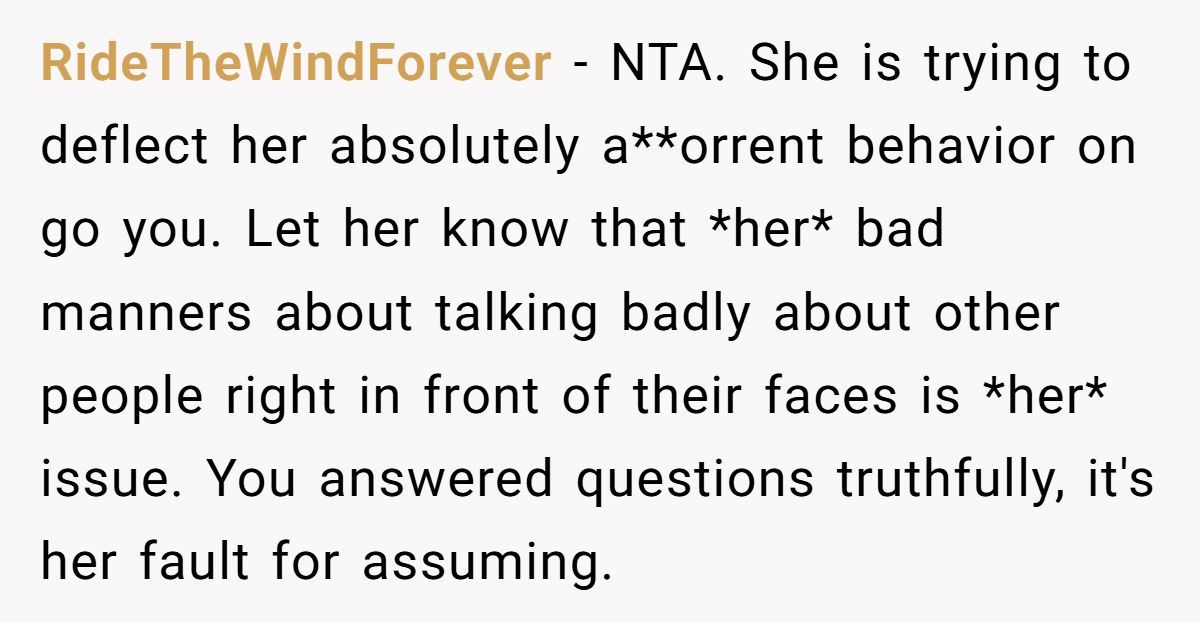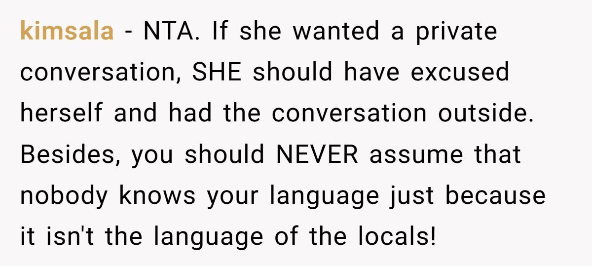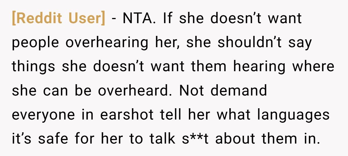 Commenters were unanimous: NTA. They slammed the girl for talking trash in public, assuming no one would understand, and then flipping the blame when caught.