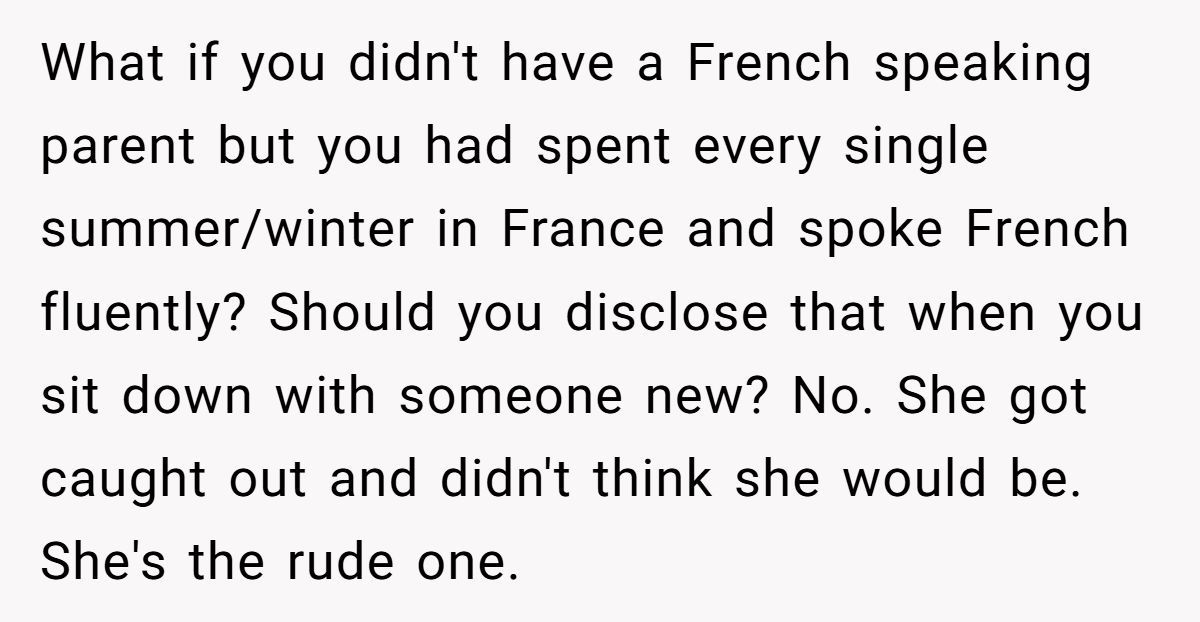 The next day, the friend messaged the Redditor, claiming she had “deceived” her by not being upfront about speaking French. She demanded an apology for what she saw as a “trap.”