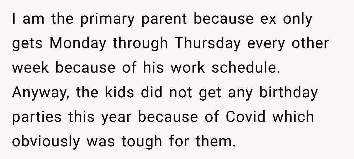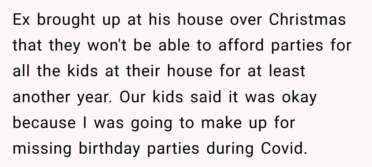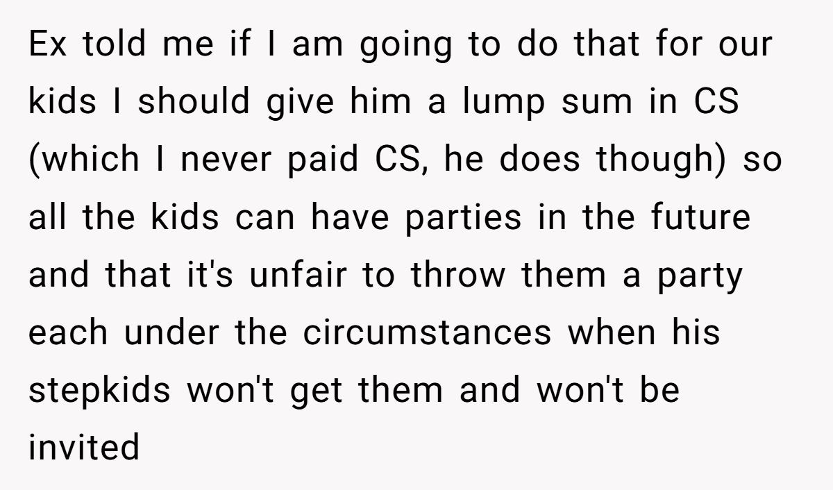 After pandemic-era birthday cancellations, she promised her 11-year-old daughter and 8-year-old son they’d finally get the celebrations they missed. Her ex—who pays child support and shares custody—suddenly asked her to chip in for three parties. For his stepkids. When she declined, he called her heartless and accused her of “dividing the family.”