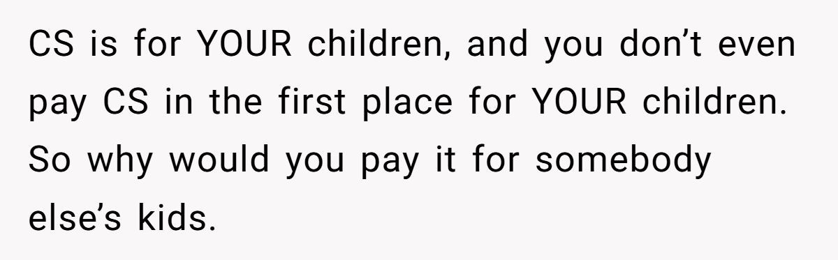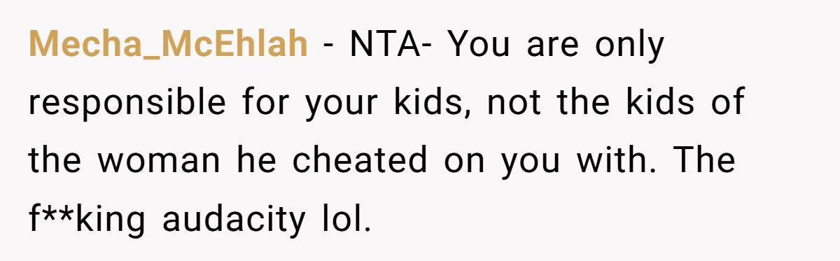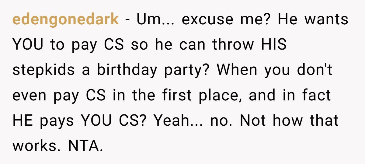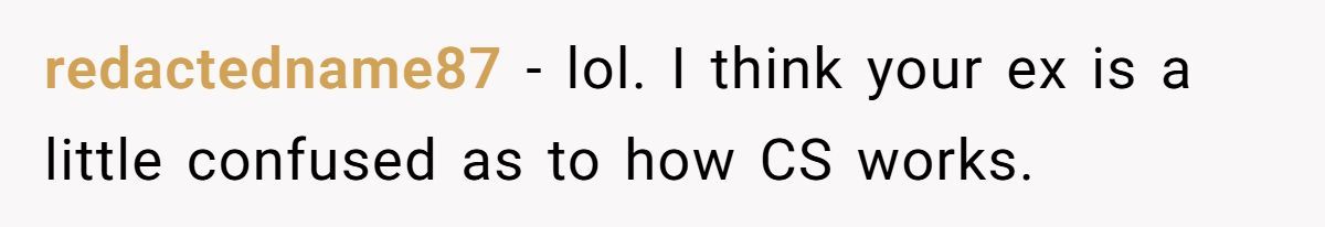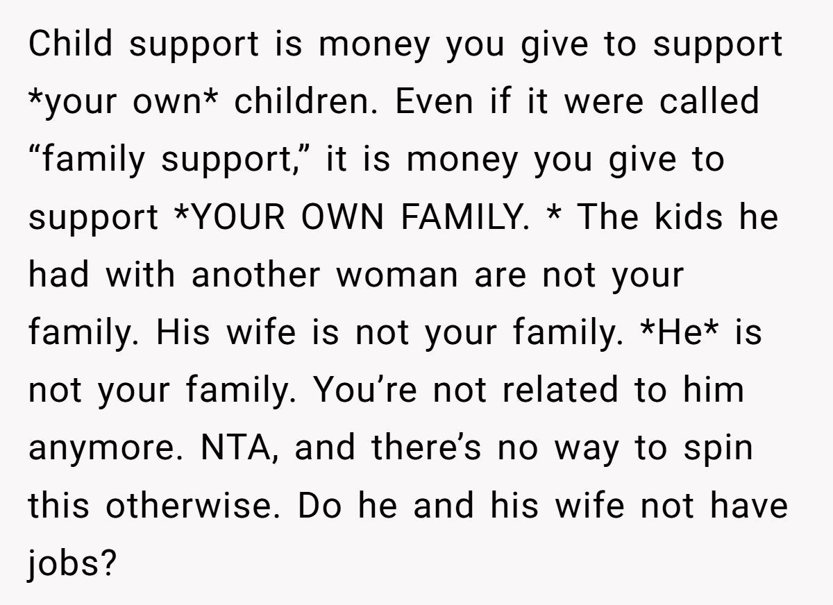 Others commenters agree she’s not the asshole—her ex’s demand is entitled, backwards, and completely misunderstands how child support works.