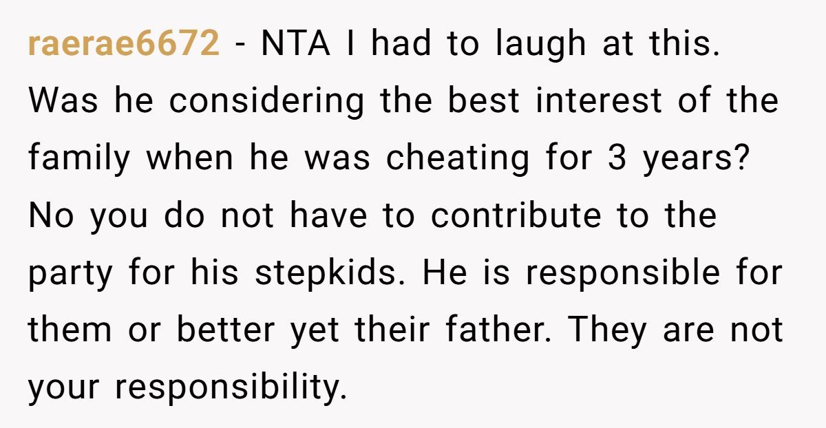 Most agree she’s not the AH—she has no obligation to support the stepkids of the man who cheated on her.