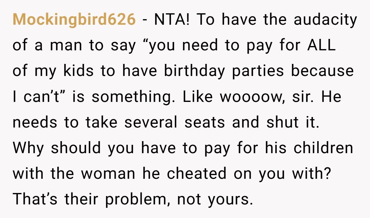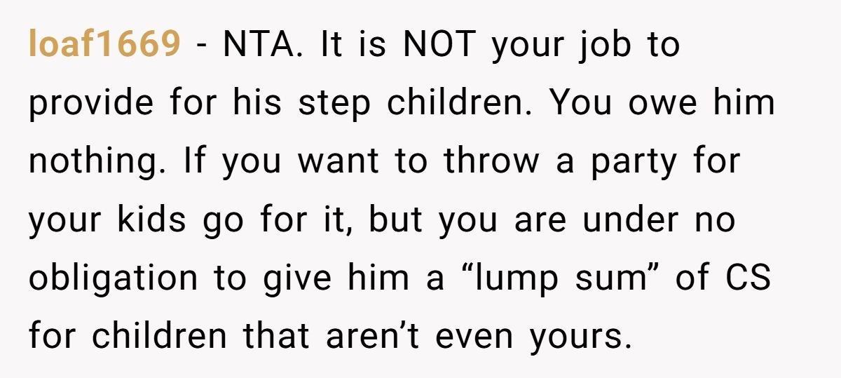Let’s be clear: parties are a want, not a need, and child support is for shared children—not bonus kids from a new marriage. The mom’s refusal to bankroll a party for kids she didn’t help create, especially when she’s receiving child support (not paying it), is financially and ethically sound.