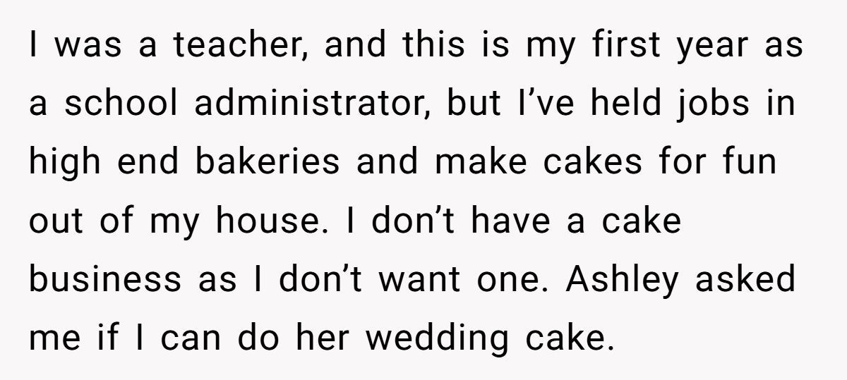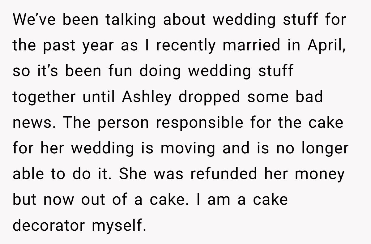 This Redditor’s frosting feud began when Ashley, her longtime friend and bride-to-be, found herself without a wedding cake baker just weeks before the big day.