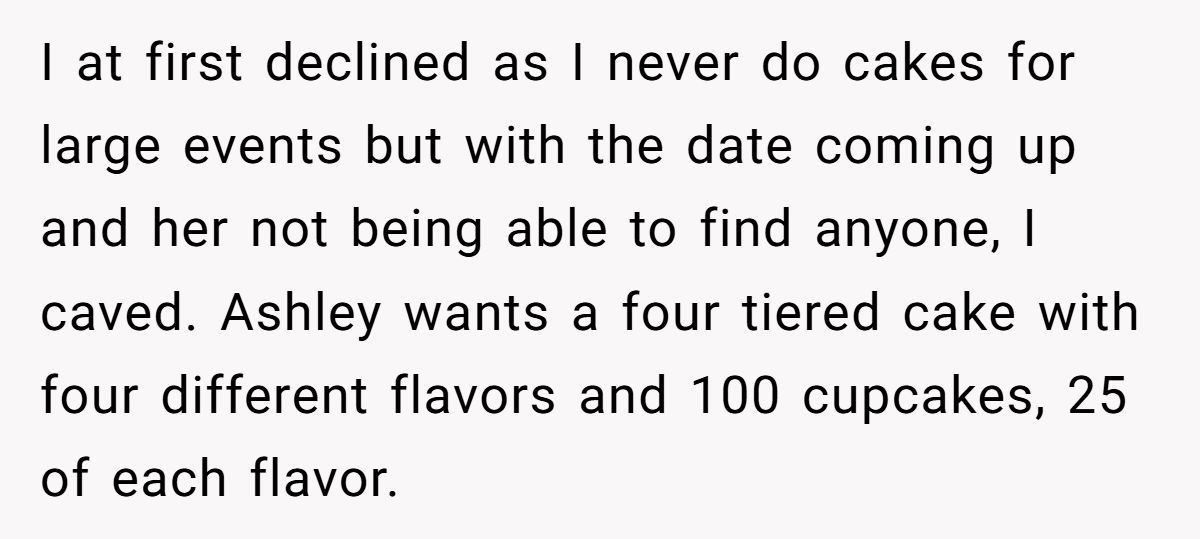 The Redditor, once a pro pastry chef, now a school administrator, agreed to step in, creating an elegant four-tier cake with handmade decorations and a hundred cupcakes to match. But the deal quickly soured when Ashley expected the elaborate order for $150, calling it a wedding gift.