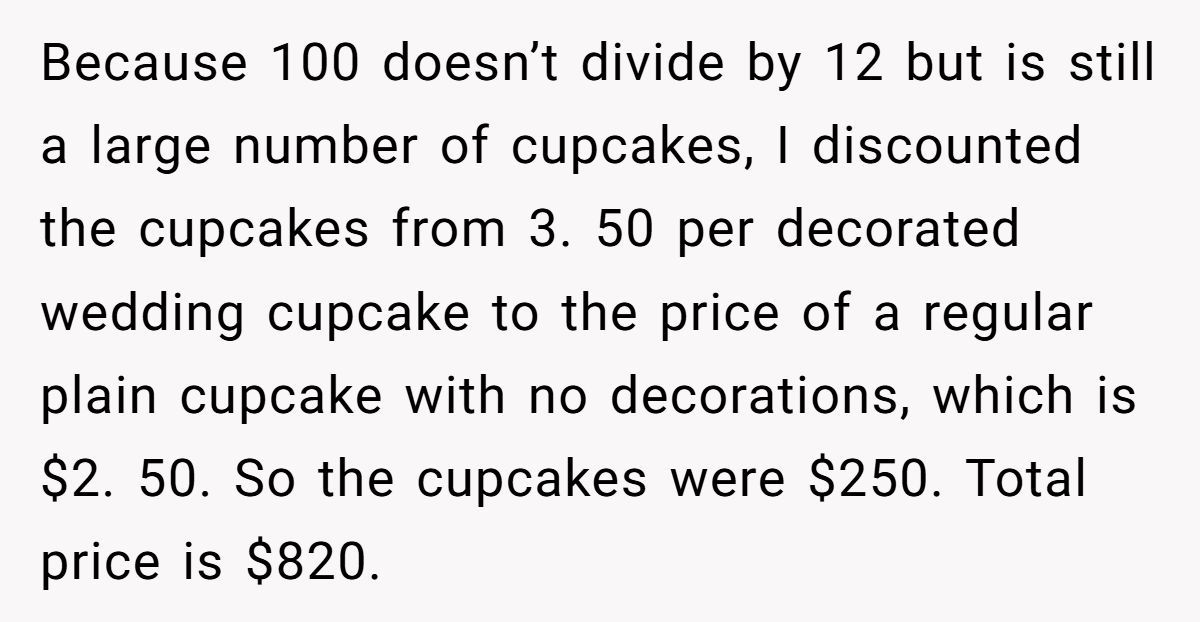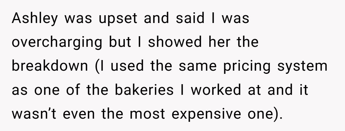Despite the Redditor’s clear breakdown of costs—$4.75 per serving, discounted cupcakes, and zero labor fees—Ashley insisted the price was too steep and claimed her friend didn’t “need the money.”