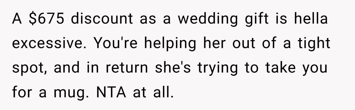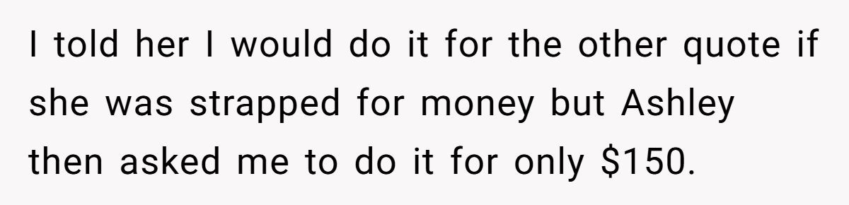 Ashley’s insistence on a deep discount, despite having paid deposits elsewhere, reflects a common issue where creative professionals are undervalued by those closest to them. Worse, rallying others to pressure the Redditor shows a lack of maturity and respect for boundaries.
