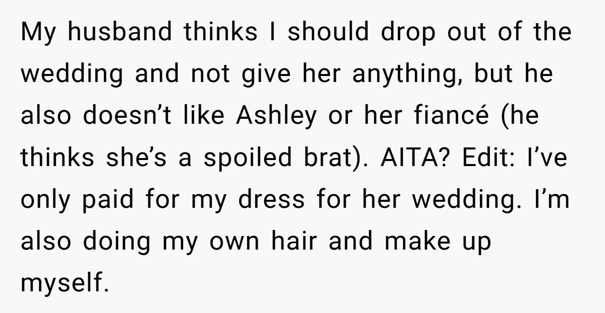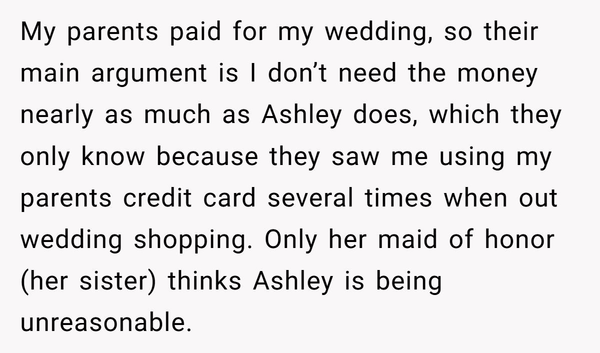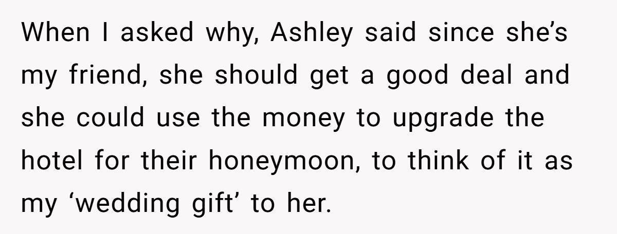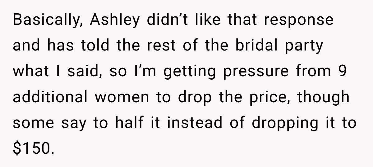 With a full price tag of $825 and a meticulous custom design, the Redditor offered a generous friend discount—just not one steep enough for the bride. When she refused to cave, Ashley stirred up drama among the bridal party, turning what should’ve been sweet into a stressful showdown.