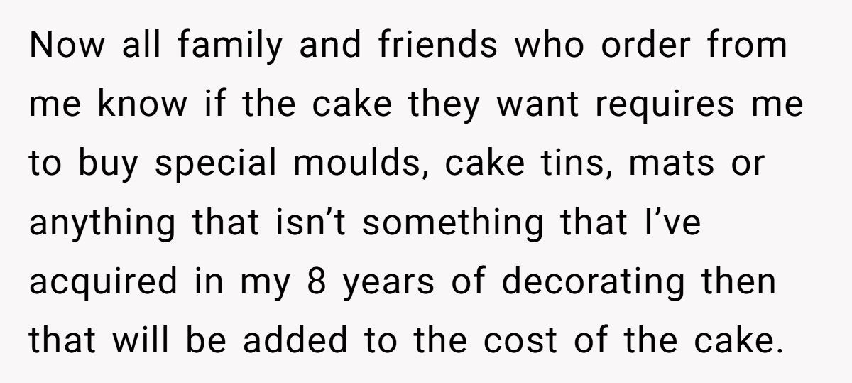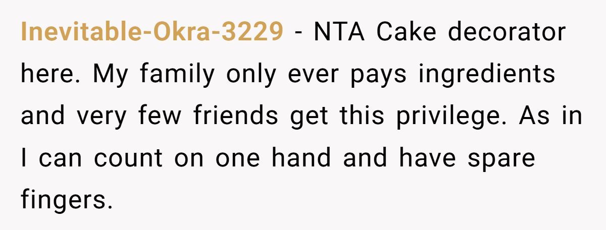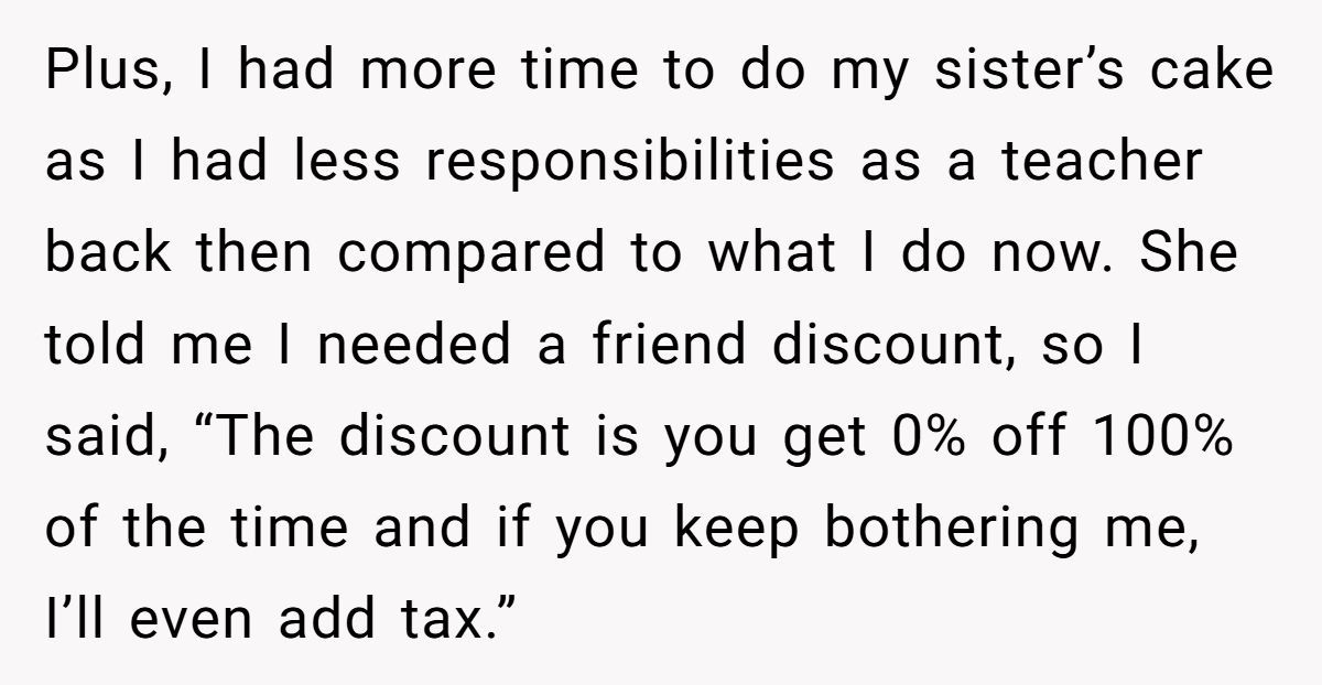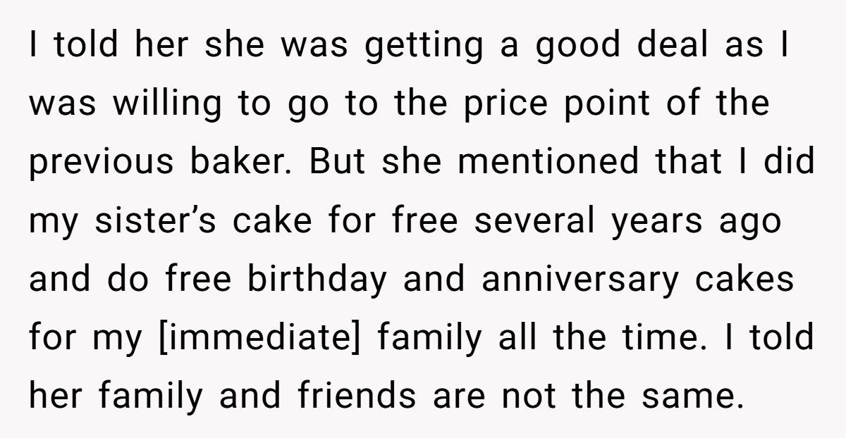 This Redditor’s wedding cake dilemma is a rich example of how quickly goodwill can curdle when boundaries are ignored. Her decision to charge fairly for a high-effort task, even for a friend, wasn’t cruel; it was responsible.
