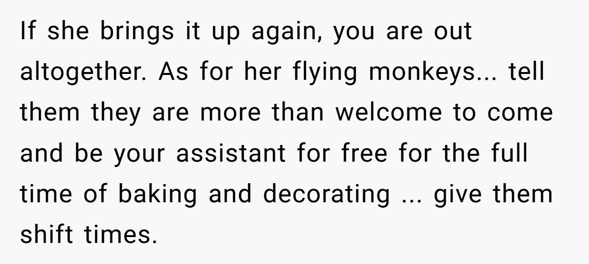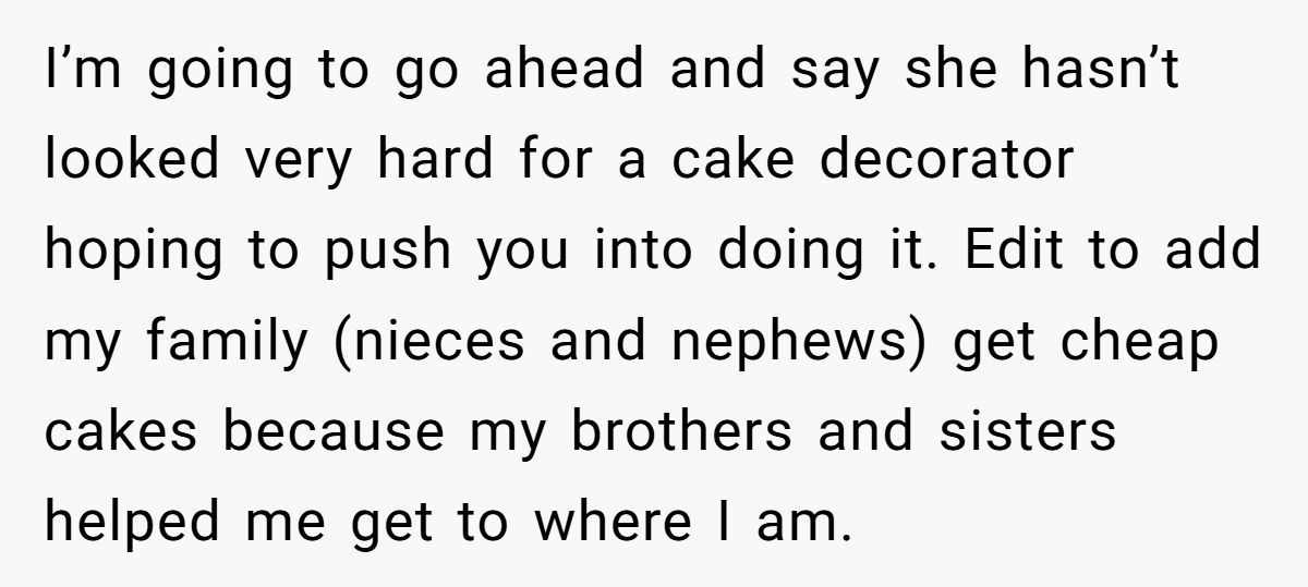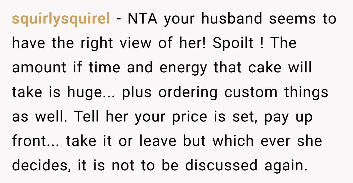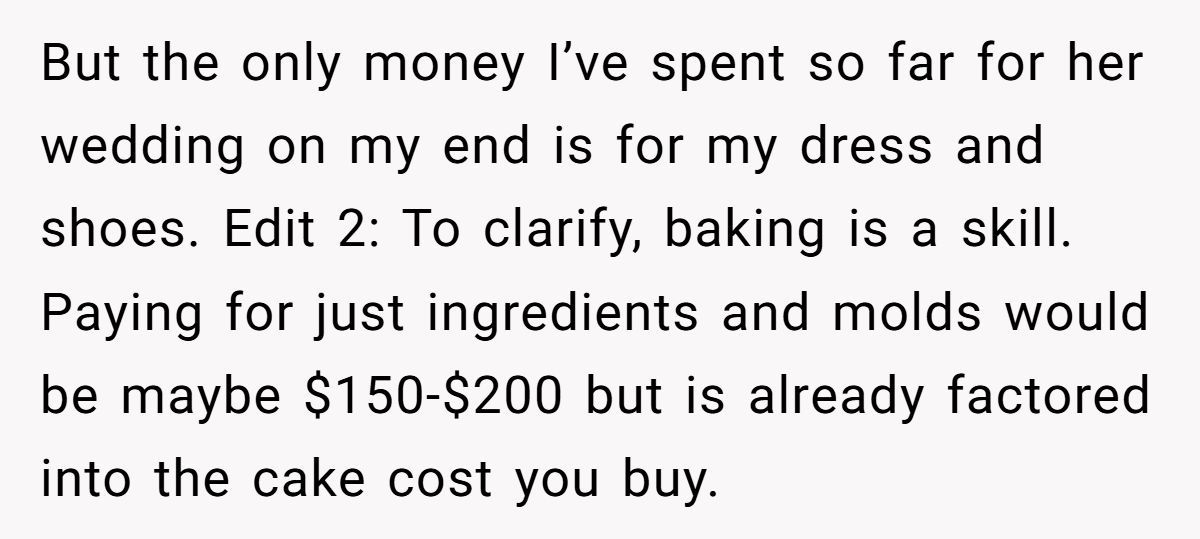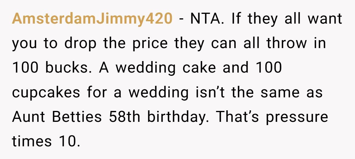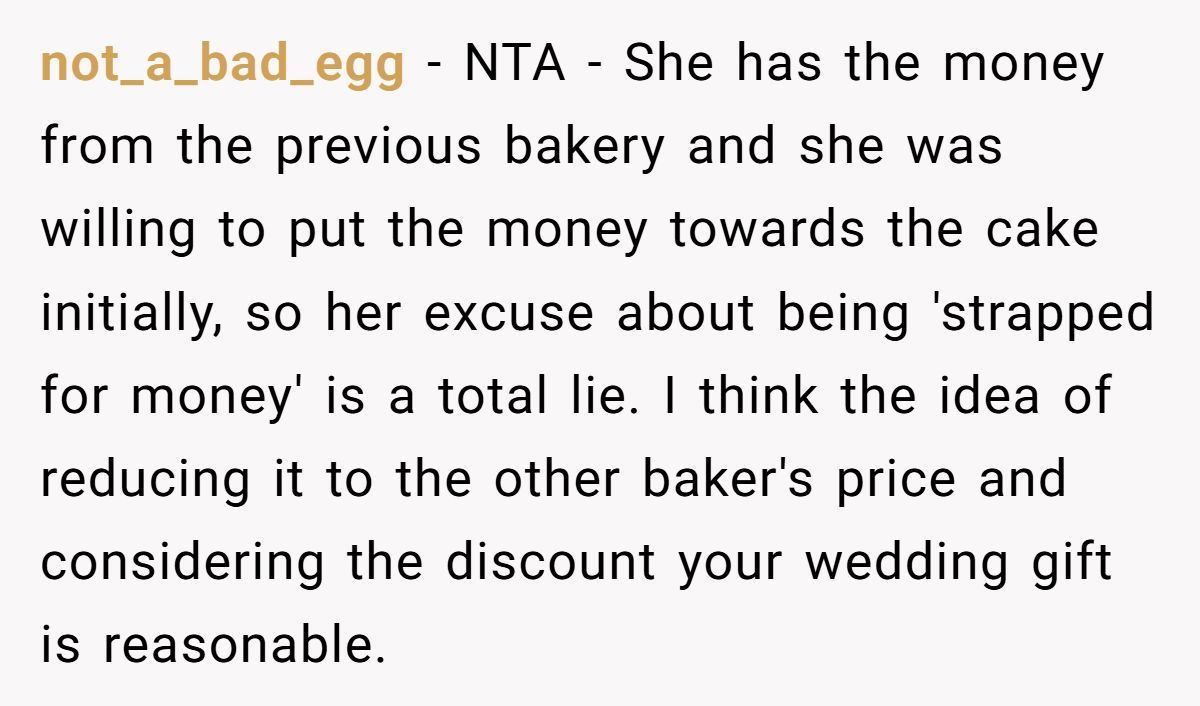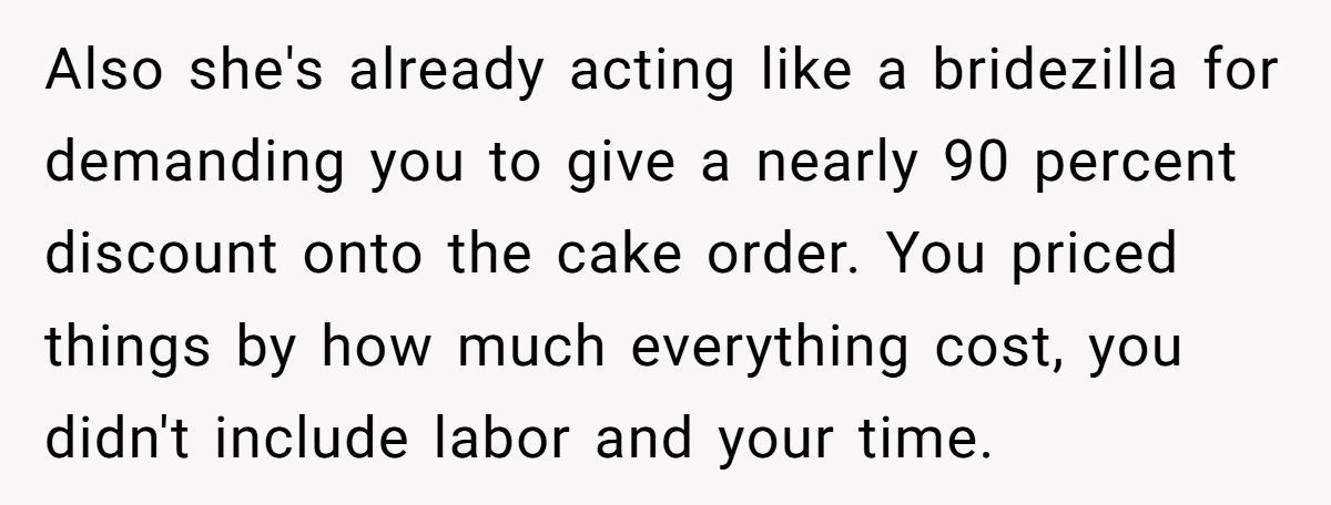 Several users, including experienced bakers, agreed that OP was more than generous—offering a steep discount as a wedding gift and still being met with manipulation.