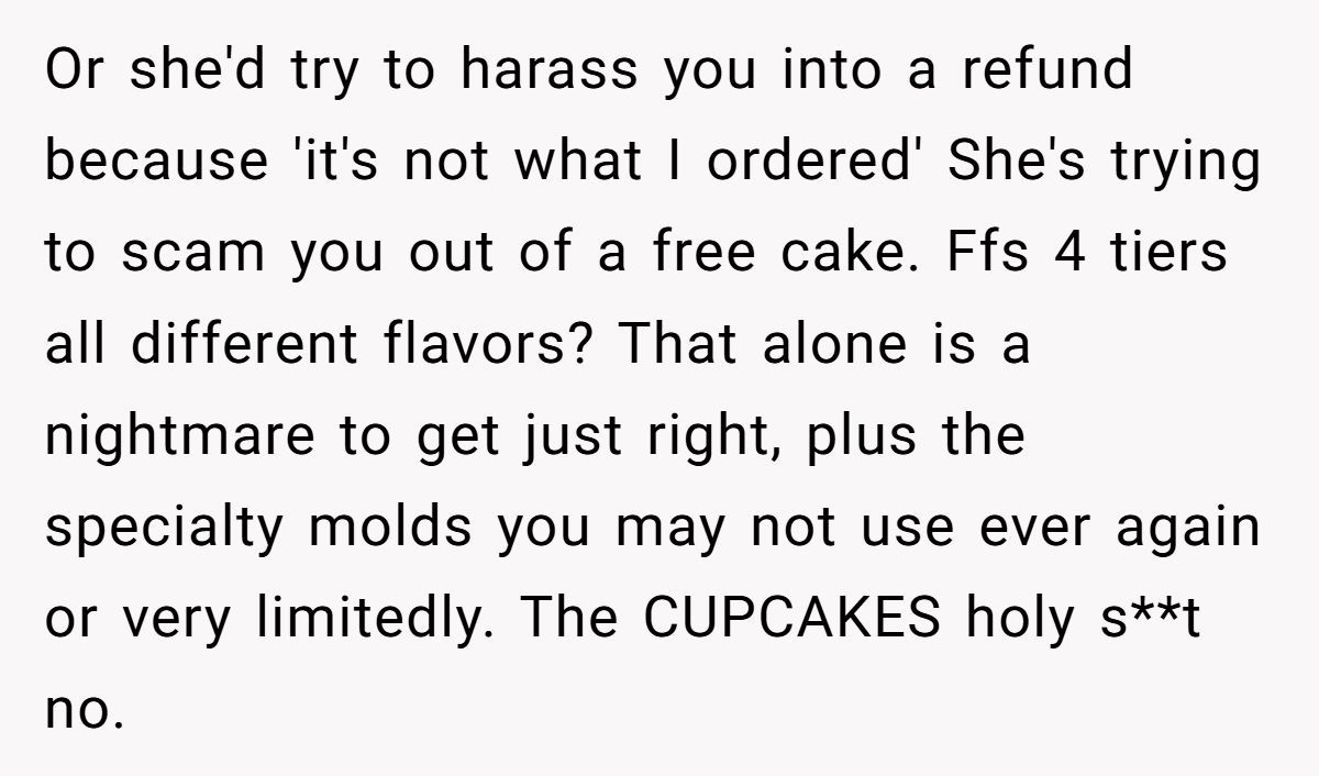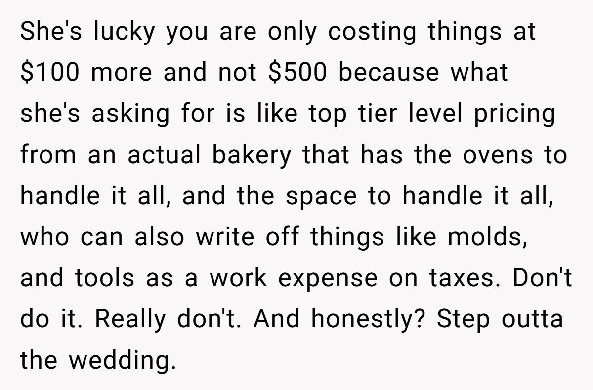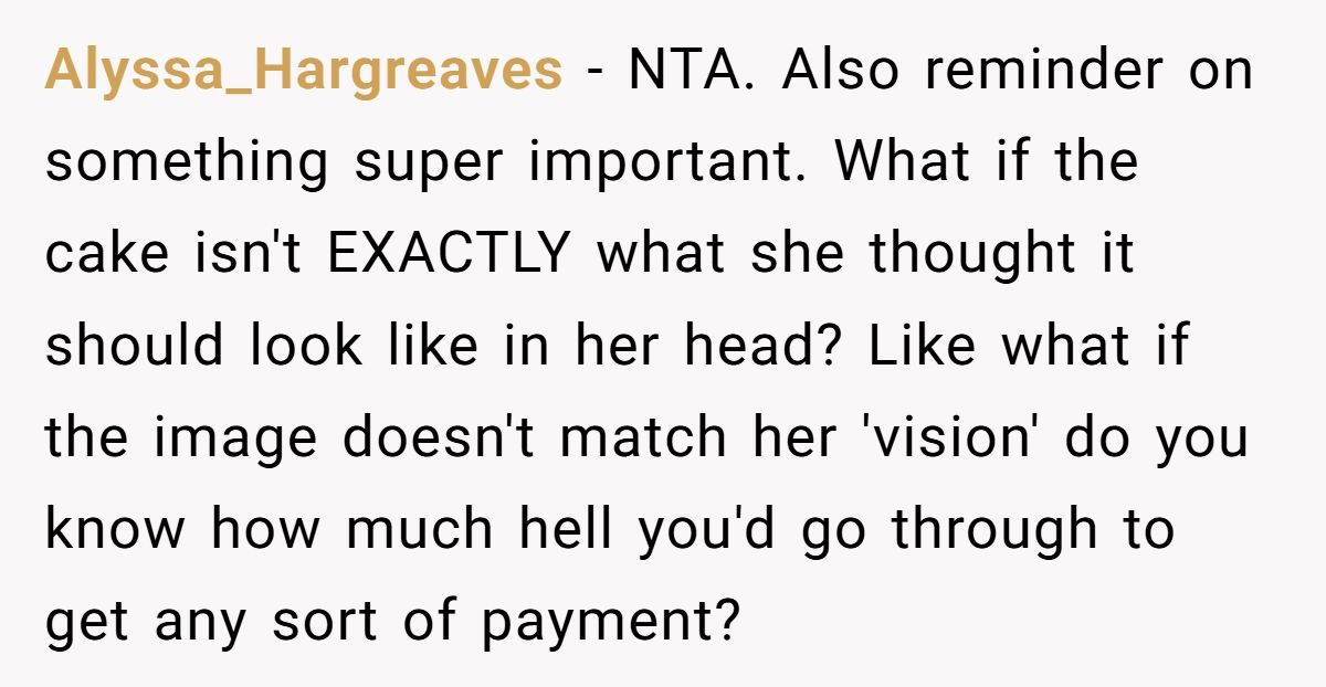Many commenters warned that making the cake could become a financial and emotional nightmare, urging the OP to step away before getting burned by a bridezilla in full meltdown mode.