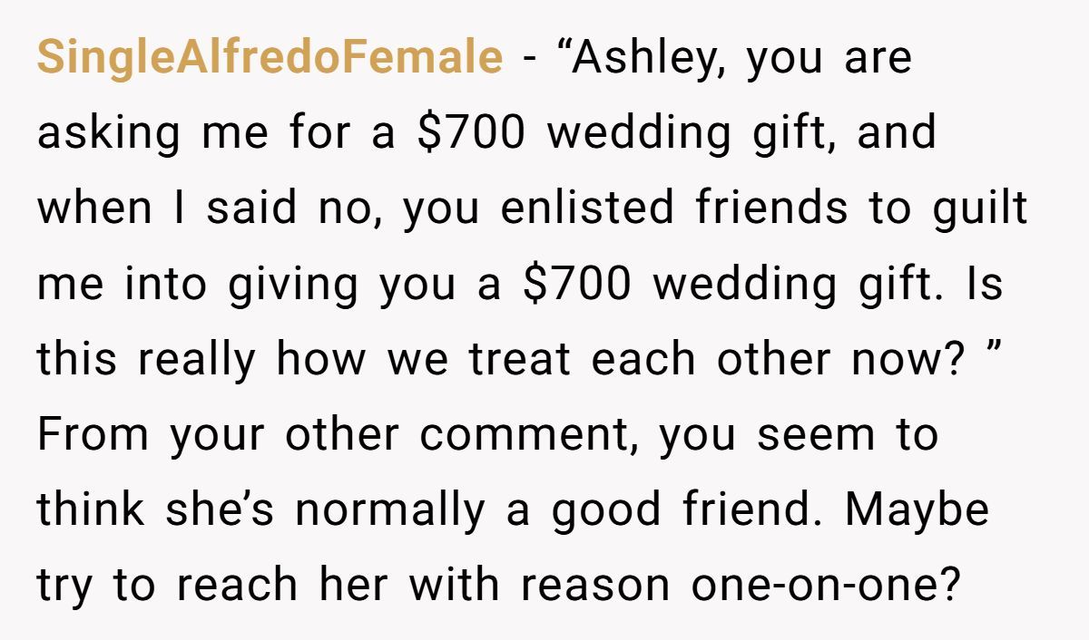 Others pointed out that true friends don’t demand extravagant gifts and then weaponize guilt trips, urging OP to stand firm and consider walking away if the pressure continues.