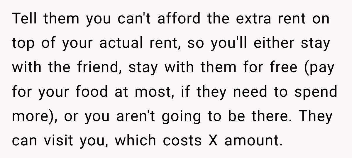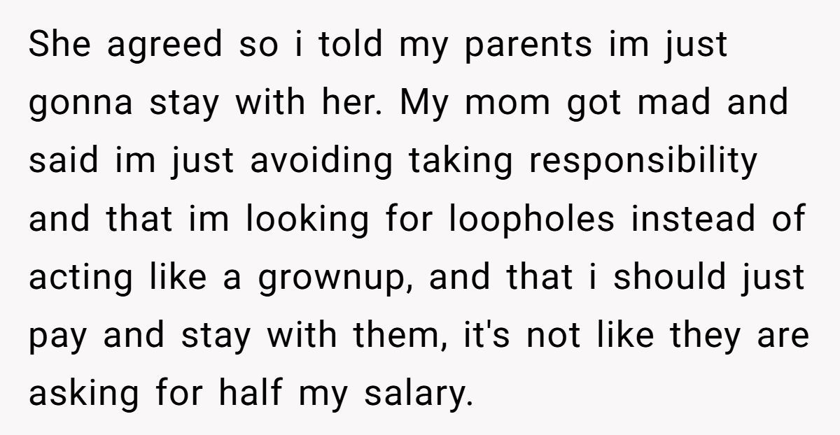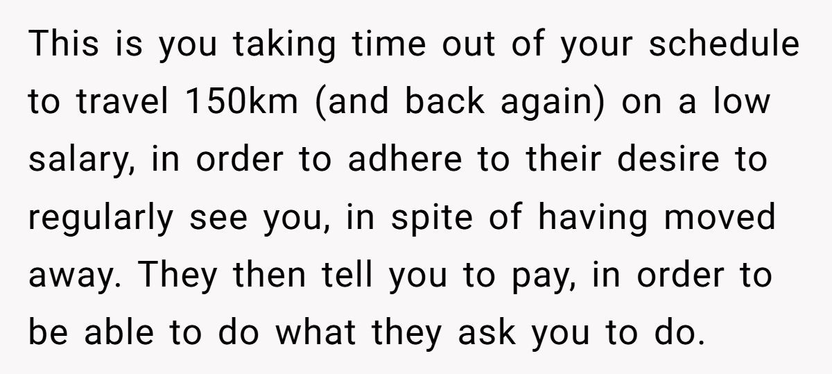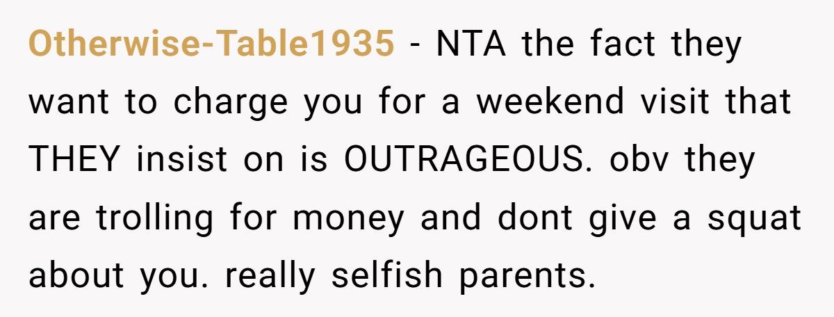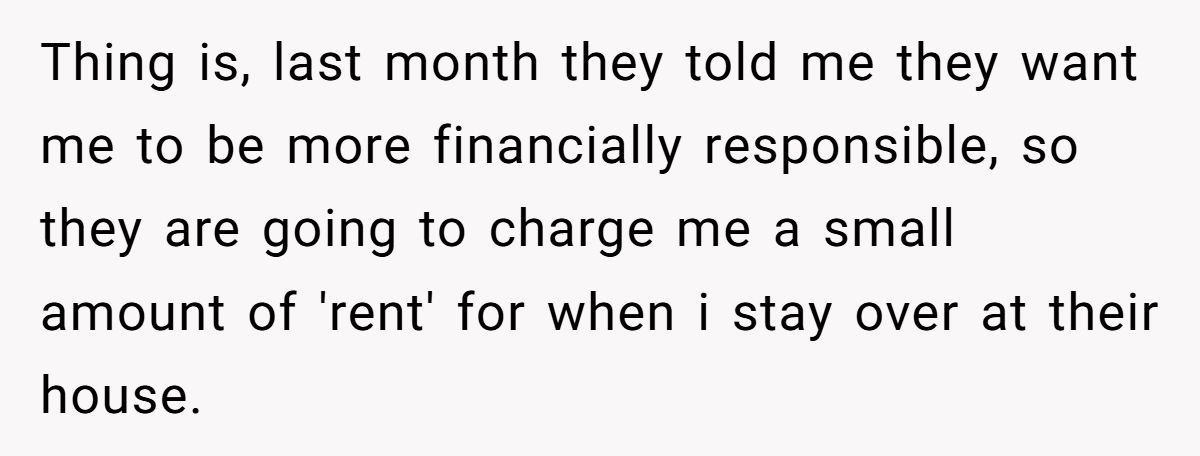 While the fee wasn’t massive, the Redditor made it clear it was never about the money—it was about the principle. Charging rent for family visits felt transactional, even punitive. They were already covering their own living expenses; this just felt like a shakedown in the name of “life lessons.”