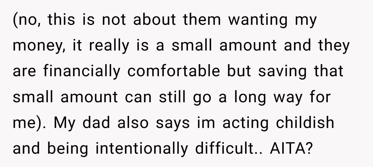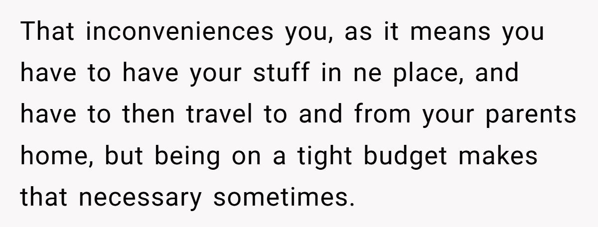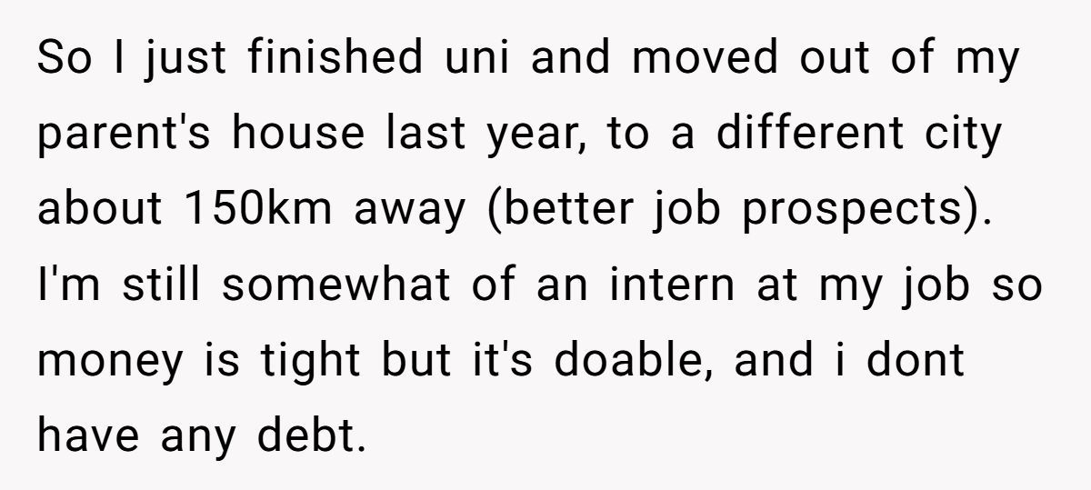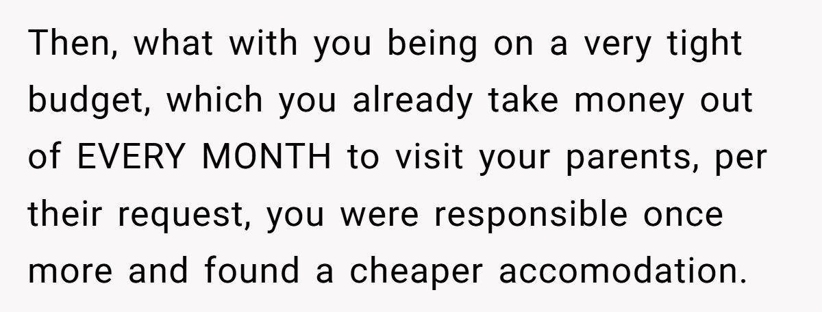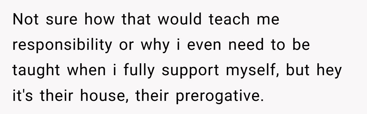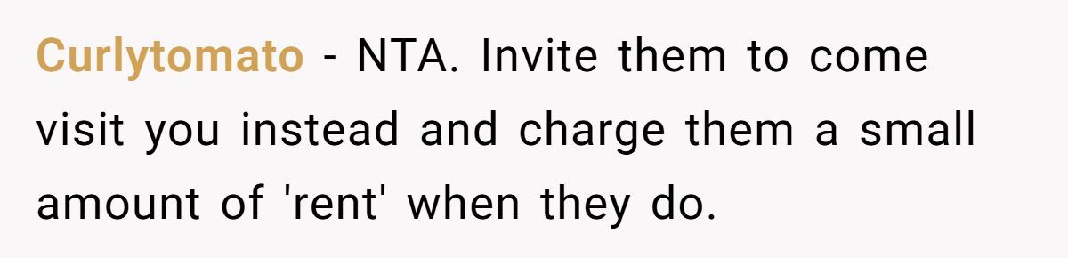 While the fee wasn’t massive, the Redditor made it clear it was never about the money—it was about the principle. Charging rent for family visits felt transactional, even punitive. They were already covering their own living expenses; this just felt like a shakedown in the name of “life lessons.”