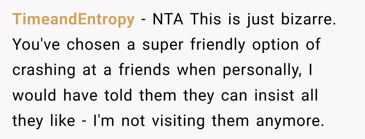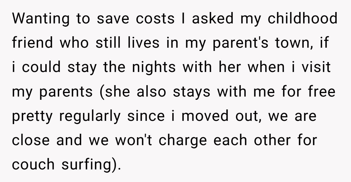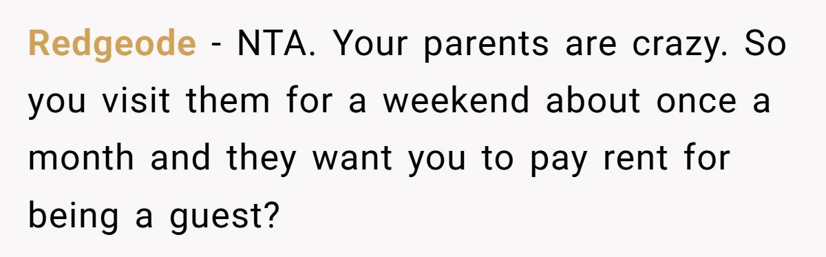 Out of nowhere, they slap you with a “rent” bill just for staying the weekend. One Redditor was floored when their parents pulled this move, and their clever response—crashing with a friend nearby for free—sparked a full-on family feud.