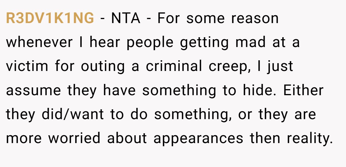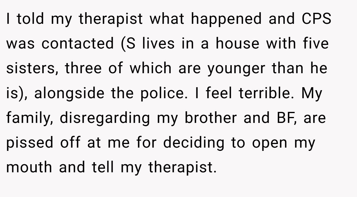 From her point of view, she had every reason to come forward. The behavior went on for years and made her feel unsafe. The later conversation crossed a clear boundary, and she felt a responsibility to protect herself, and potentially others, since he lived with younger siblings. Sharing with a therapist, which led to broader involvement, was about safety, not revenge.
