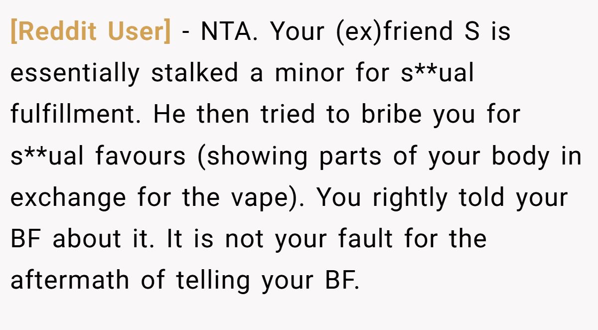 ![She Ruined Her Brother’s Best Friend’s Life - But Was It Justified? [Reddit User] − NTA. Your (ex)friend S is essentially stalked a minor for s**ual fulfillment. He then tried to bribe you for s**ual favours (showing parts of your body in exchange for the vape). You rightly told your BF about it. It is not your fault for the aftermath of telling your BF.](https://dailyhighlight.com/wp-content/uploads/2025/07/43378-17.jpg)