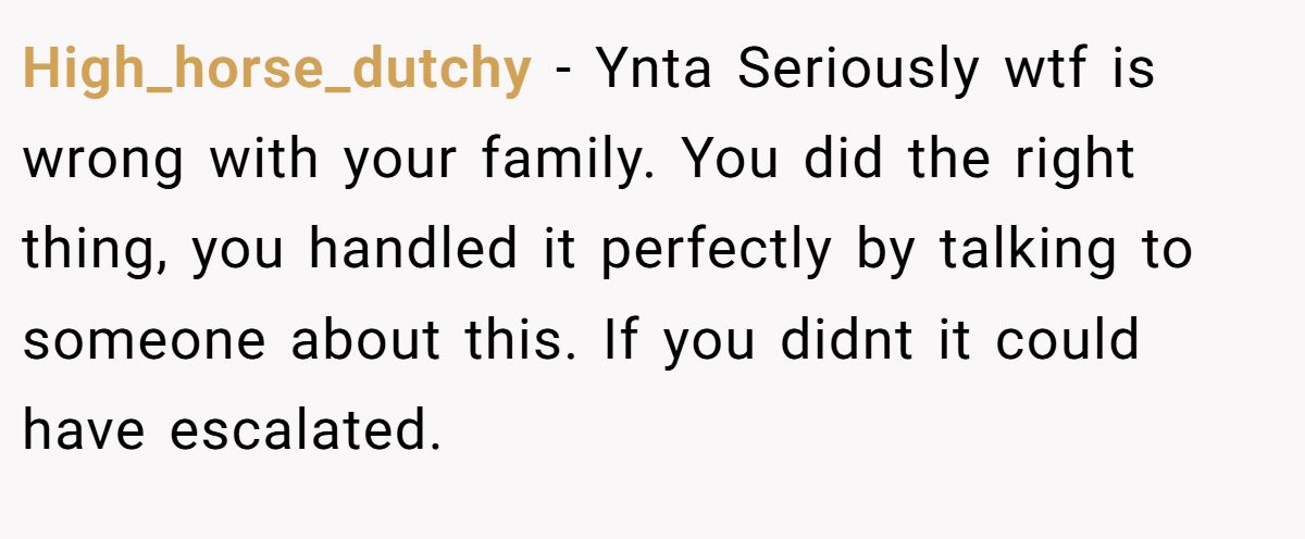 High_horse_dutchy expressed disbelief at the family’s reaction, praising Zoe for doing exactly what someone in her position should do, speaking to a trusted adult before things got worse.