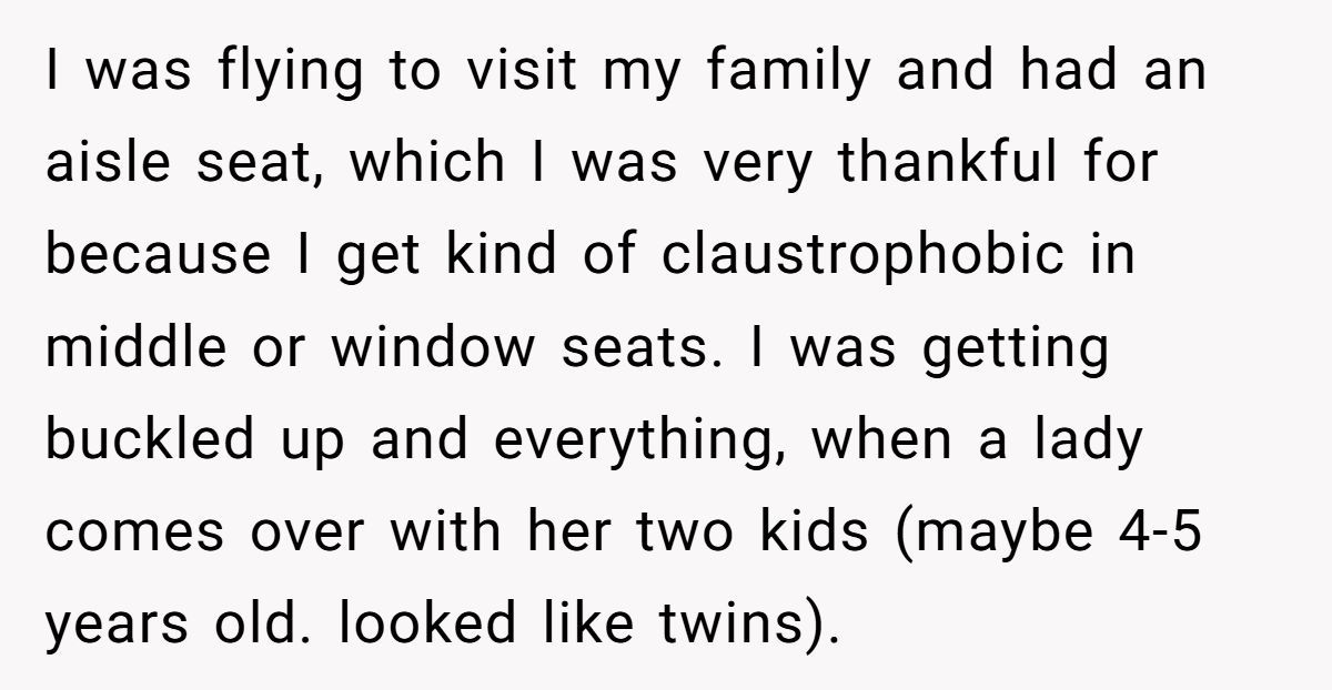 When you’re flying, being asked to switch seats can feel like an impossible situation, especially if you have real reasons for where you’re sitting. In this case, the Redditor needed the aisle because of claustrophobia. The mom, on the other hand, was clearly overwhelmed trying to juggle two small children.