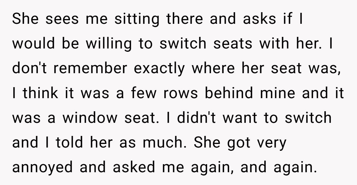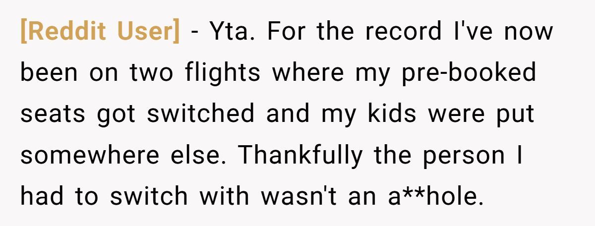 The Redditor politely said no, explaining they couldn’t handle being stuck by the window. That’s a fair boundary. But the mom’s frustration wasn’t completely out of nowhere. Airlines often reassign seats at the last minute, leaving families scattered around the cabin.