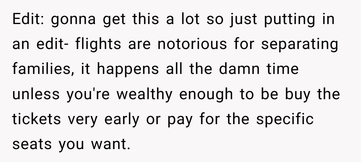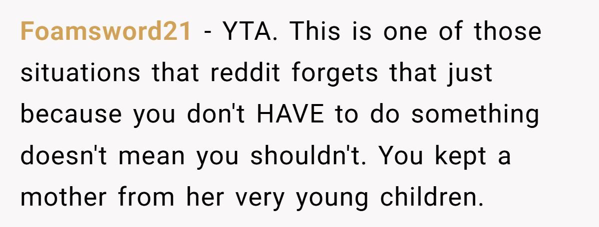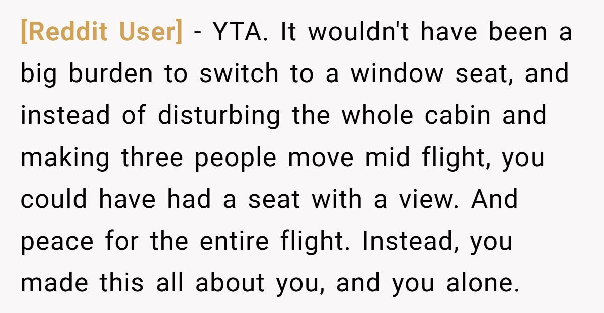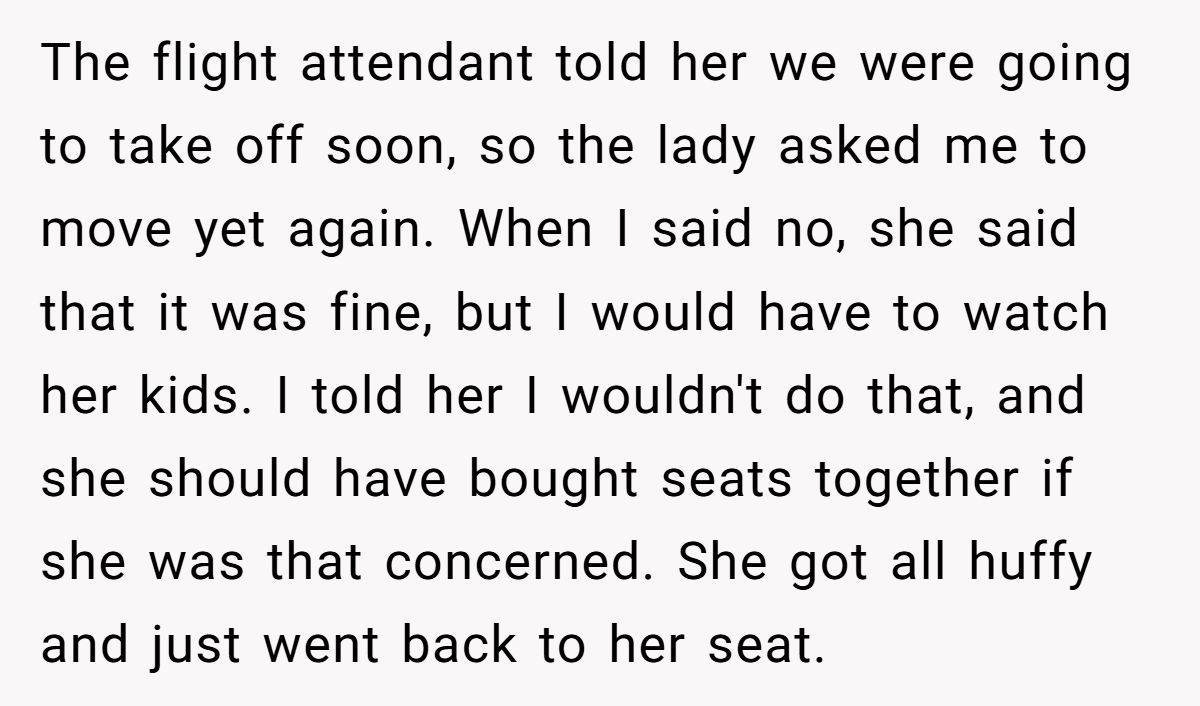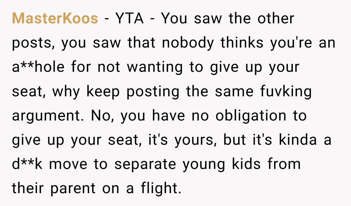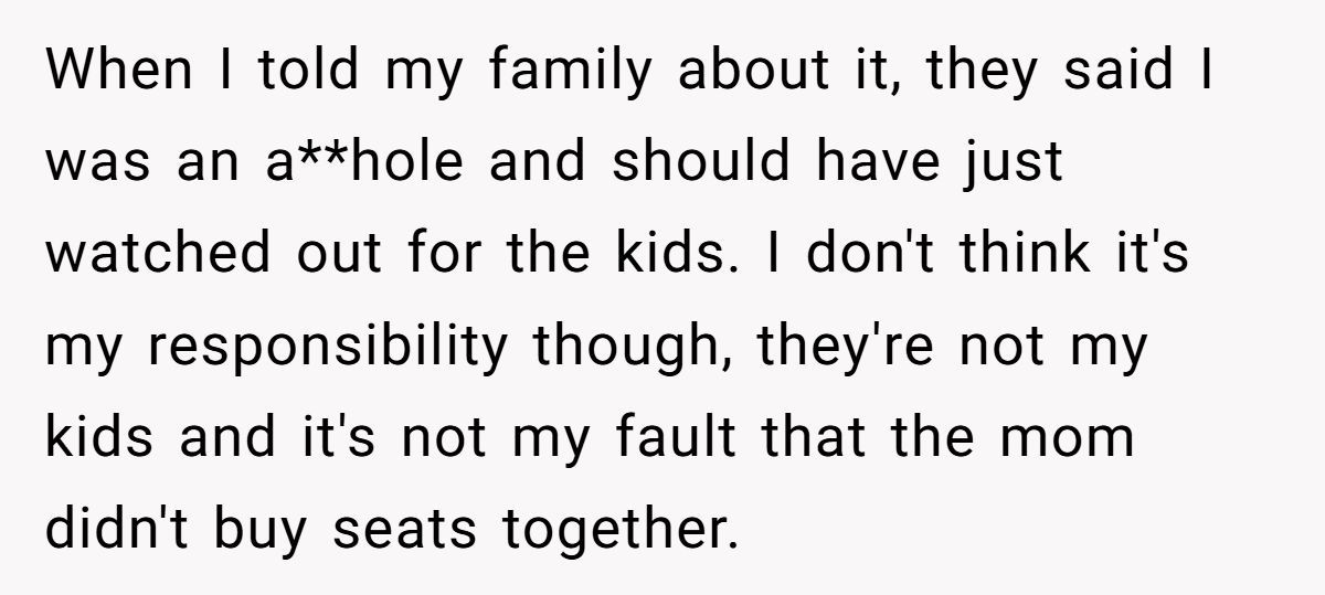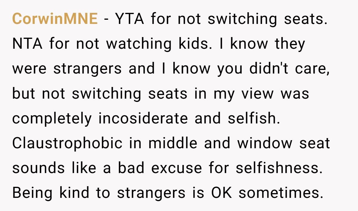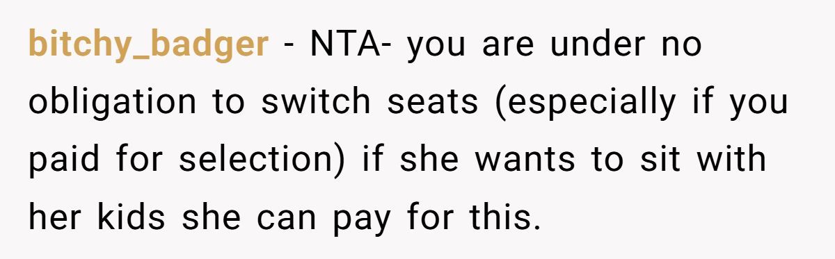 Redditors were divided—some felt the poster wasn’t obligated to move since they paid for the seat, while others thought refusing to help a mom sit with her young kids was unkind and lacked empathy.