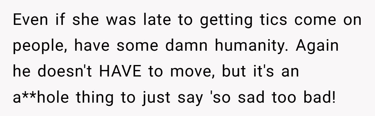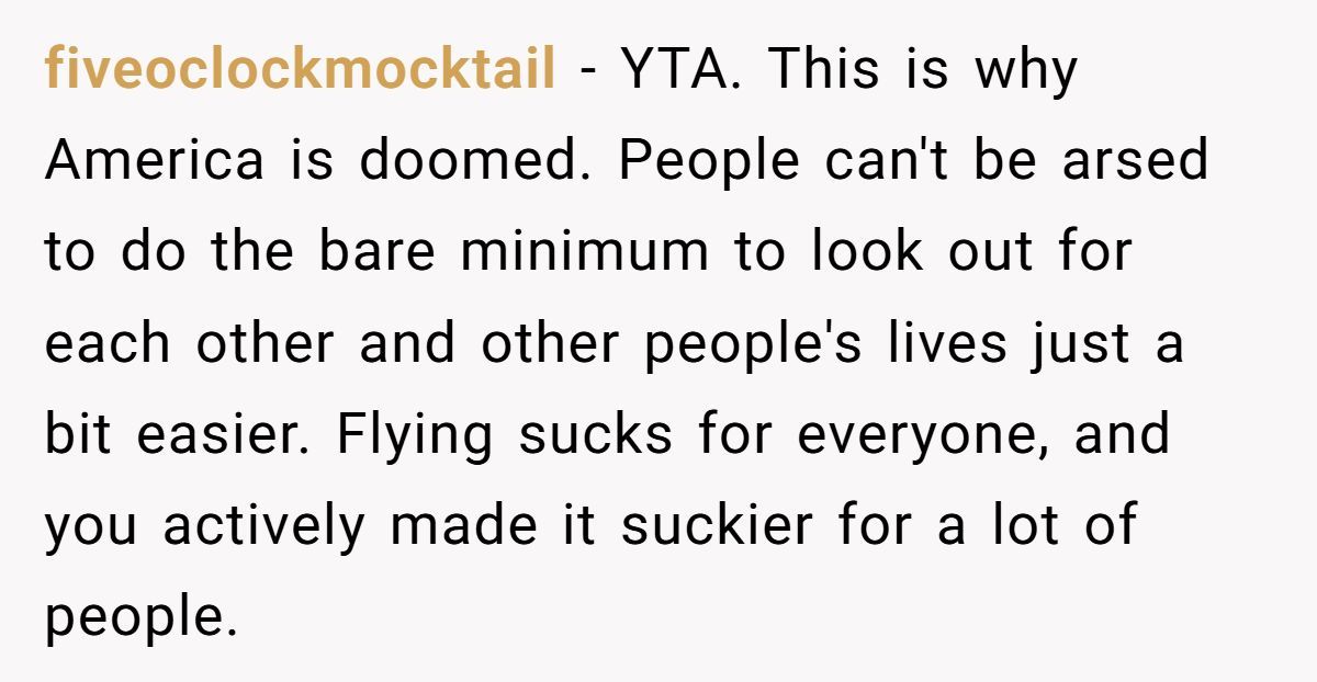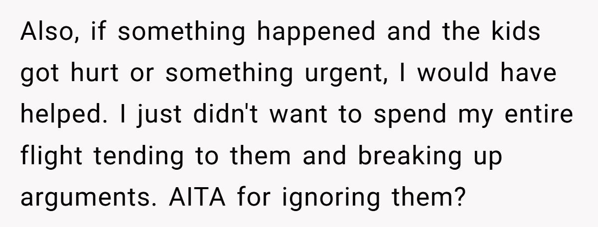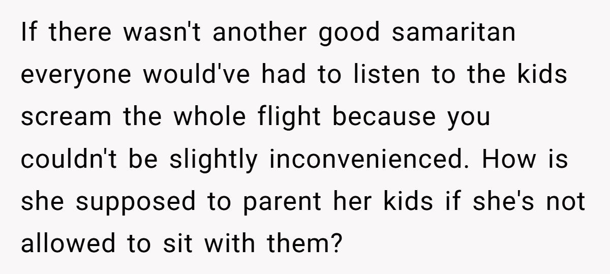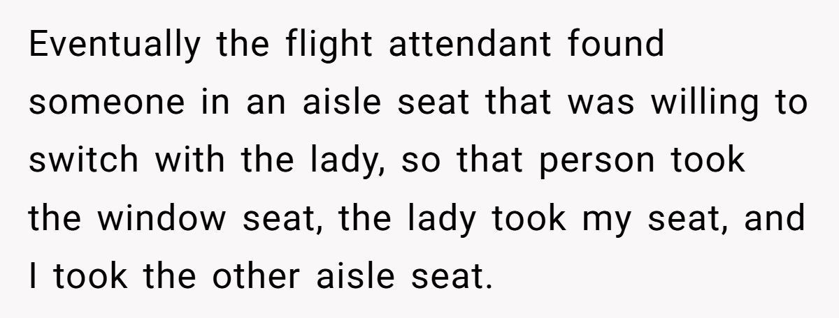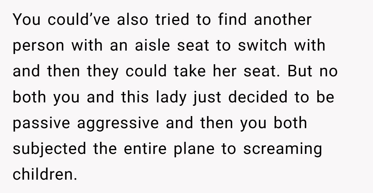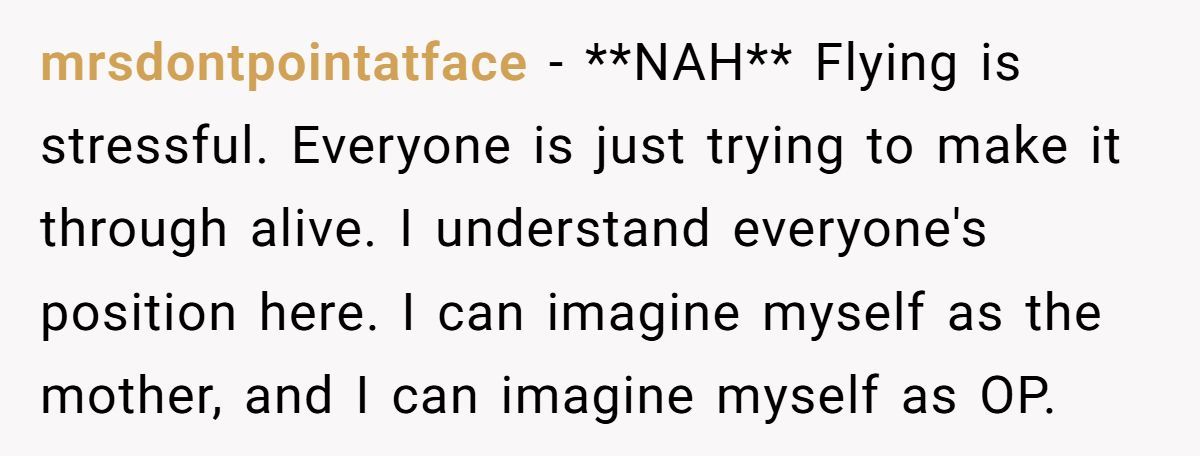 Even a small gesture—like offering to help the mom find another aisle seat swap, or calling over a flight attendant—might have eased the tension. Instead, both people dug in, and the kids’ meltdown became a soundtrack everyone had to endure.