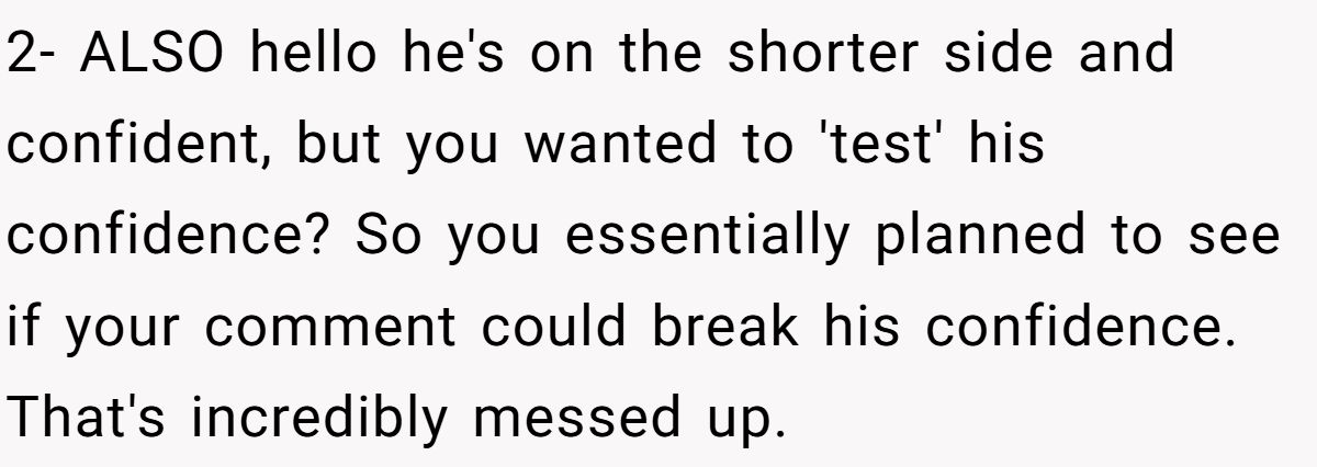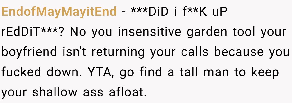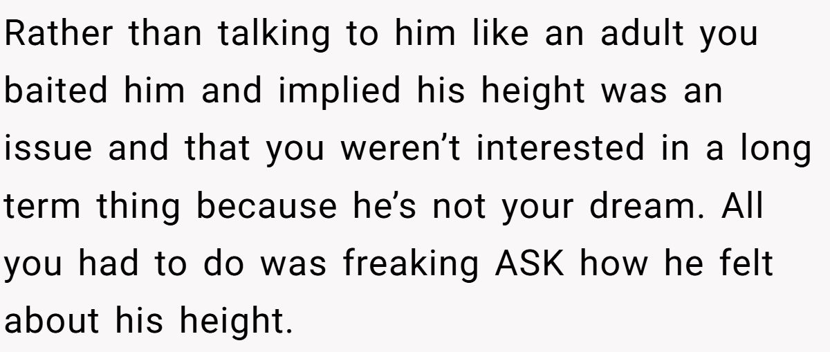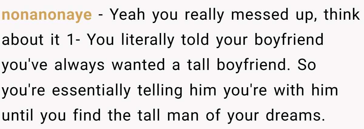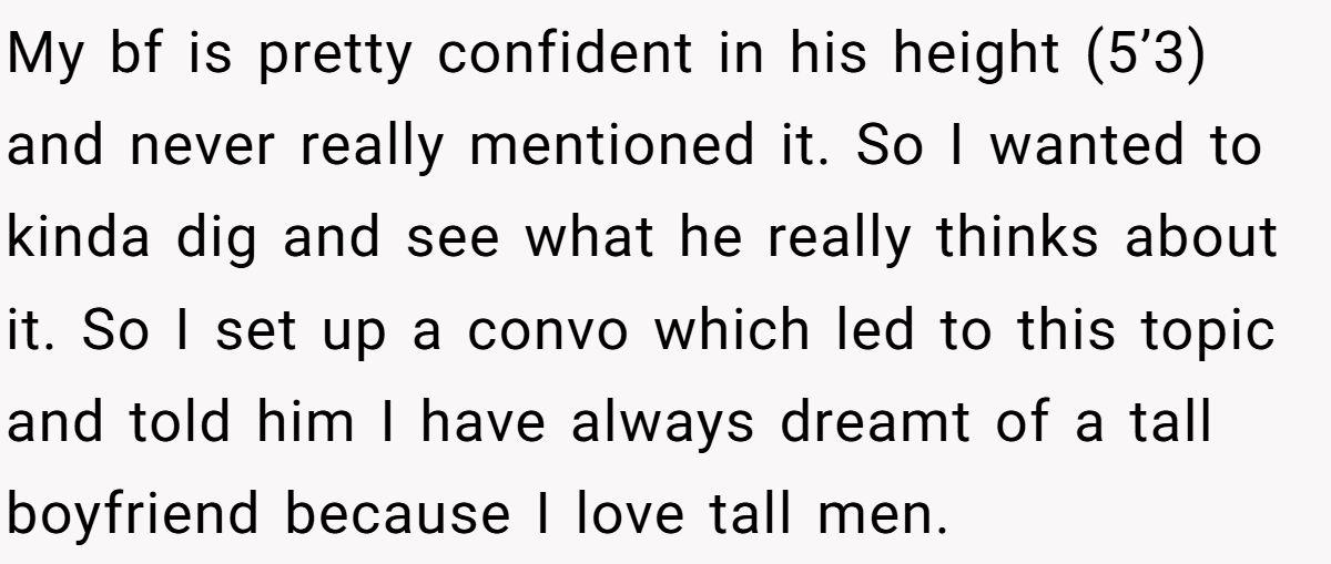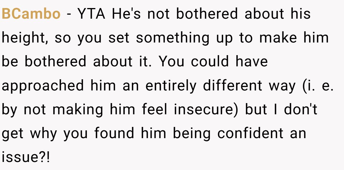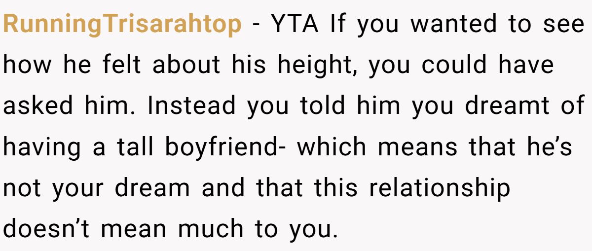 Most commenters agreed OP was the AH. They felt she didn’t need to plant insecurity about her boyfriend’s height and could have simply asked how he felt instead of implying he wasn’t her “dream.”
