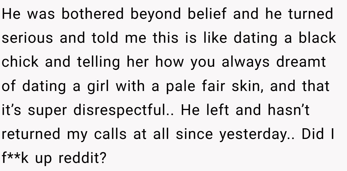 At 5’3”, he went still, then quietly replied that her comment felt like someone saying they’d always wanted a partner of a different race.
