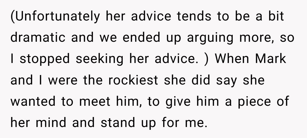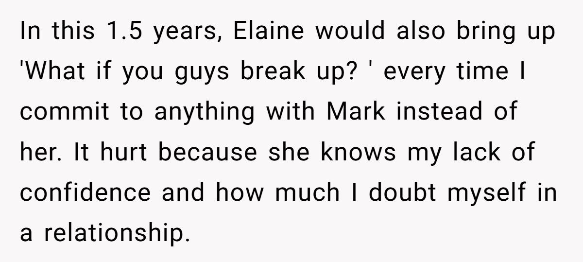 Elaine was once a solid source of support, but now her constant doubts feel like tiny darts, making the Redditor avoid meetups to protect her relationship and her peace of mind. When Elaine recently snapped about never meeting Mark, the tension hit its peak.