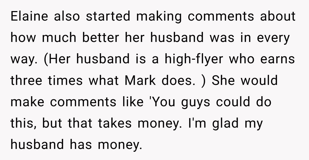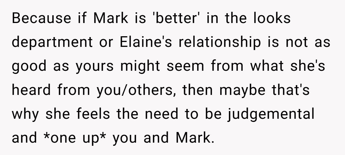 It’s not surprising the Redditor feels uneasy. Elaine’s little digs—comparing Mark to her successful husband or questioning whether he’ll stick around—are subtle but damaging. Even Elaine’s excuse about “shielding her toddler” from Mark feels more like an excuse to plant seeds of doubt.