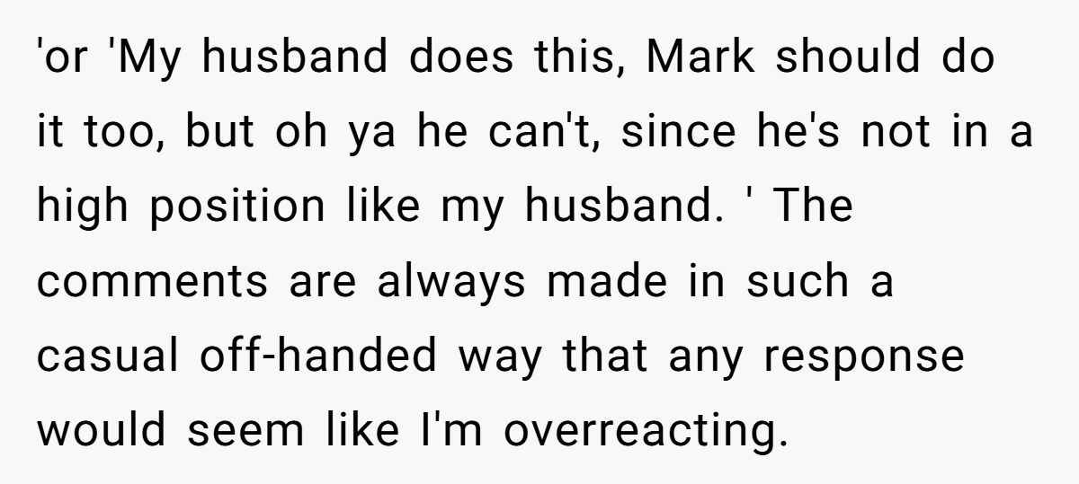 Elaine’s bragging about her husband might even hint at her own insecurities, as one commenter pointed out. By constantly comparing, she boosts her own sense of security while chipping away at her friend’s confidence.