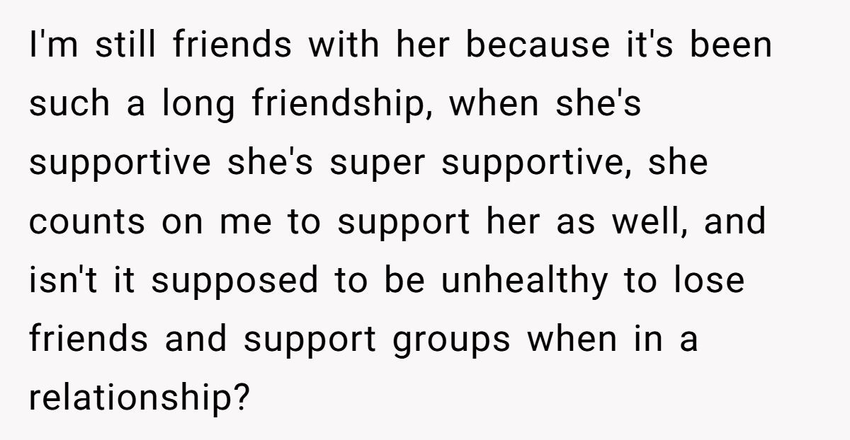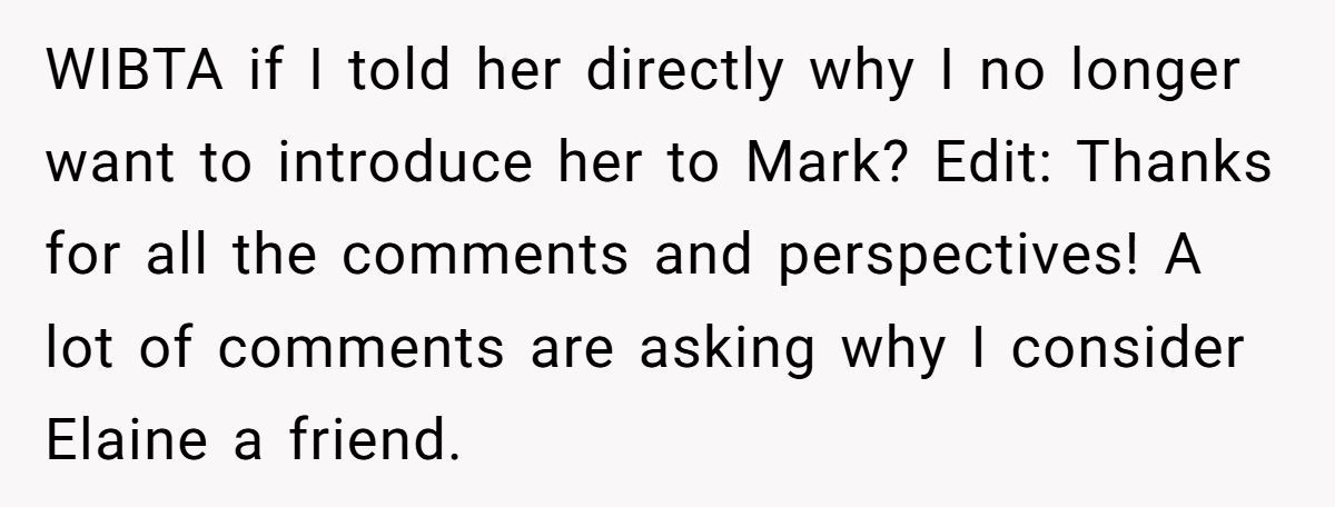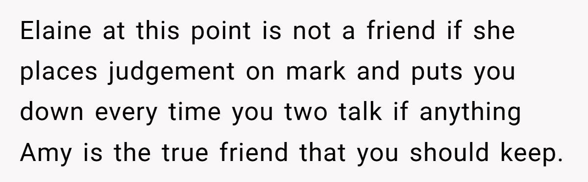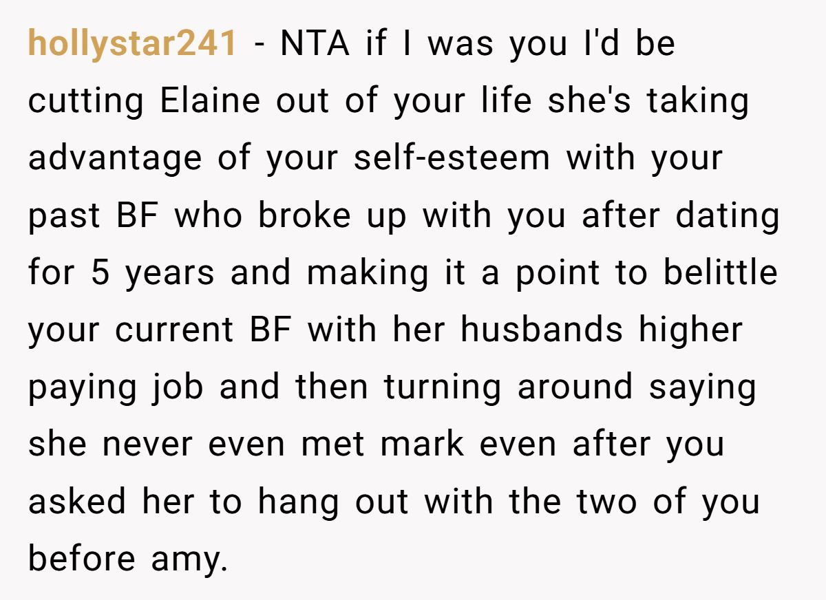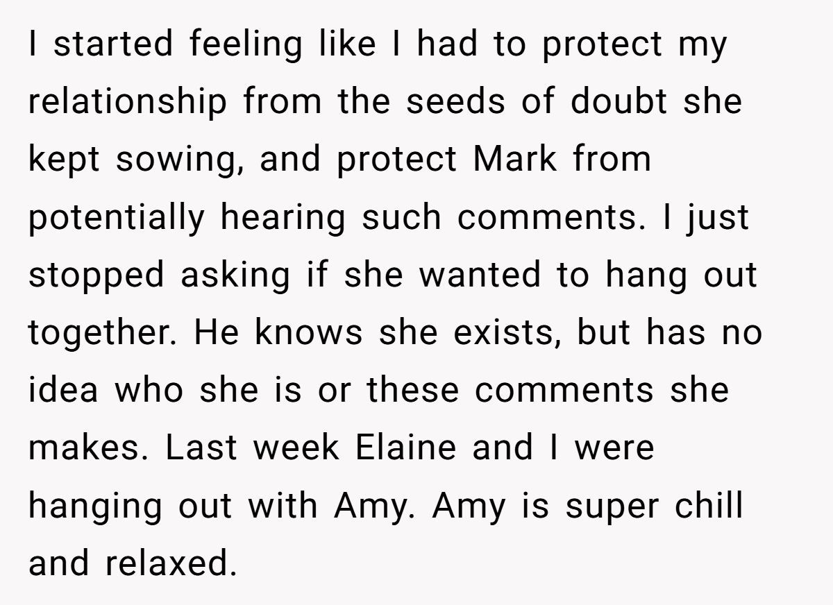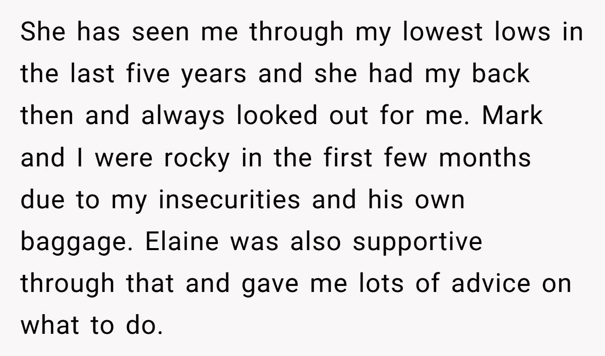 Our Redditor is stuck between wanting to keep Elaine in her life and needing to protect her relationship with Mark. Elaine was there through heartbreak and rough patches, but her recent behavior sounds less supportive and more judgmental.