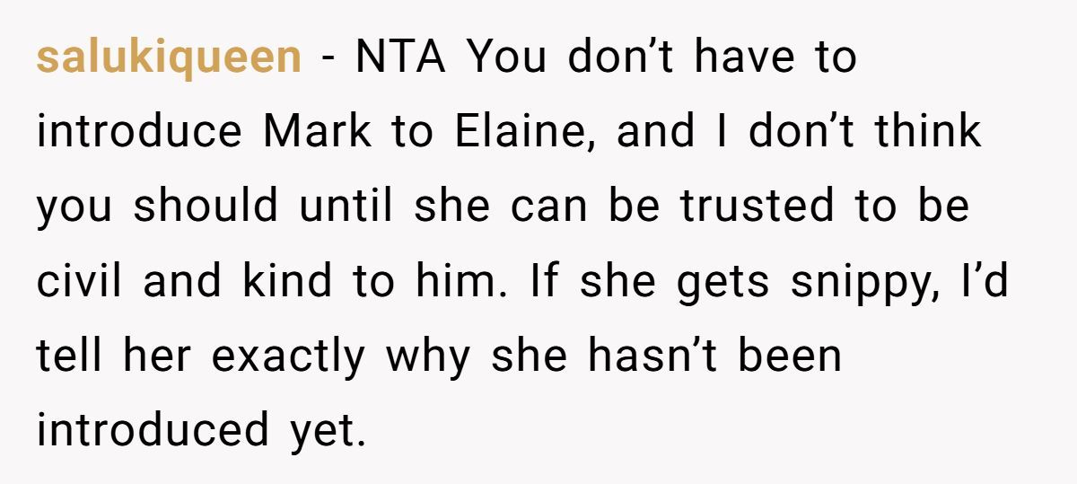 Redditors weighed in, with most agreeing she was NTA for not introducing Mark to Elaine until Elaine could be respectful.