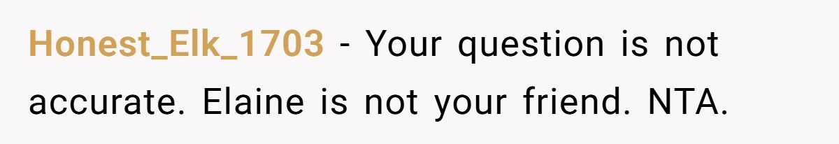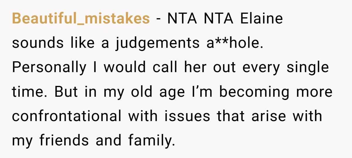 Other commenters agreed she was NTA and wondered why she kept a friendship with someone so rude and judgmental like Elaine.