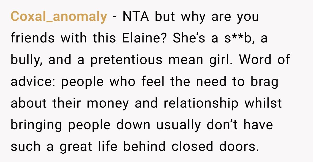 Reddit users overwhelmingly felt she was NTA, with many pointing out that Elaine’s judgmental behavior showed she wasn’t a real friend at all.