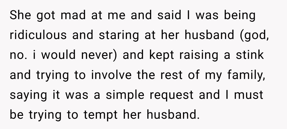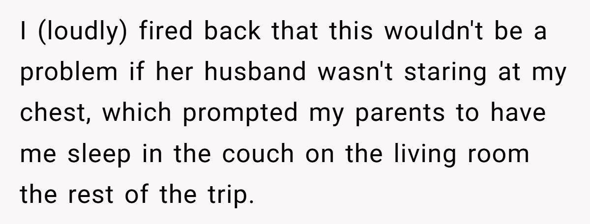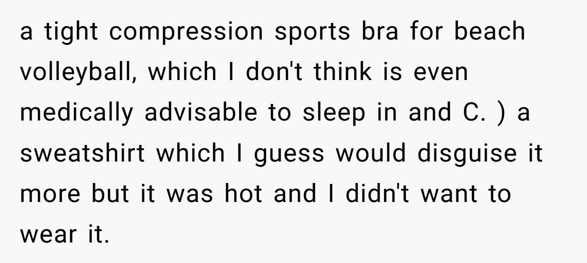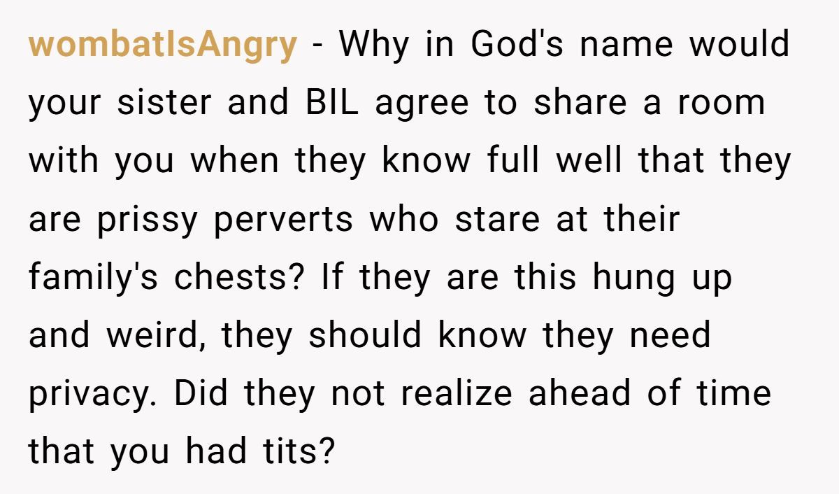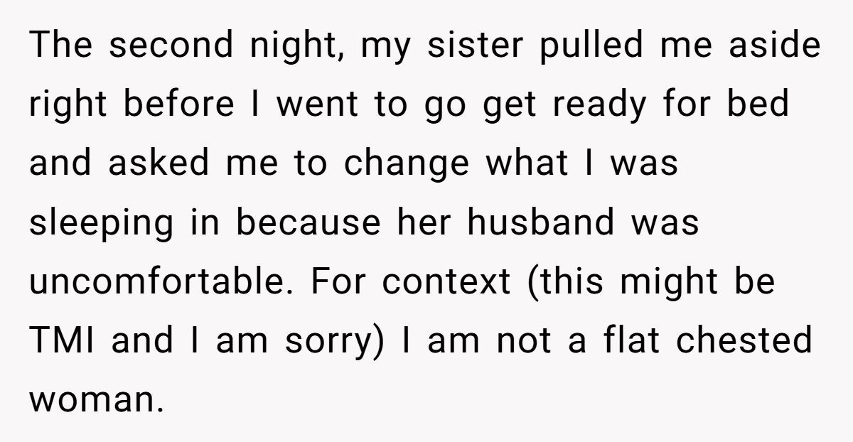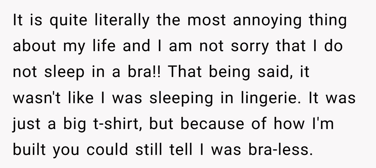 Mia was sharing a room with her older sister and that sister’s new husband. Not ideal, but manageable. She kept to herself, wore a large T-shirt and shorts to bed, and tried to be respectful. But on the second night, her sister pulled her aside with an odd concern: her lack of a bra was making the brother-in-law “uncomfortable.”