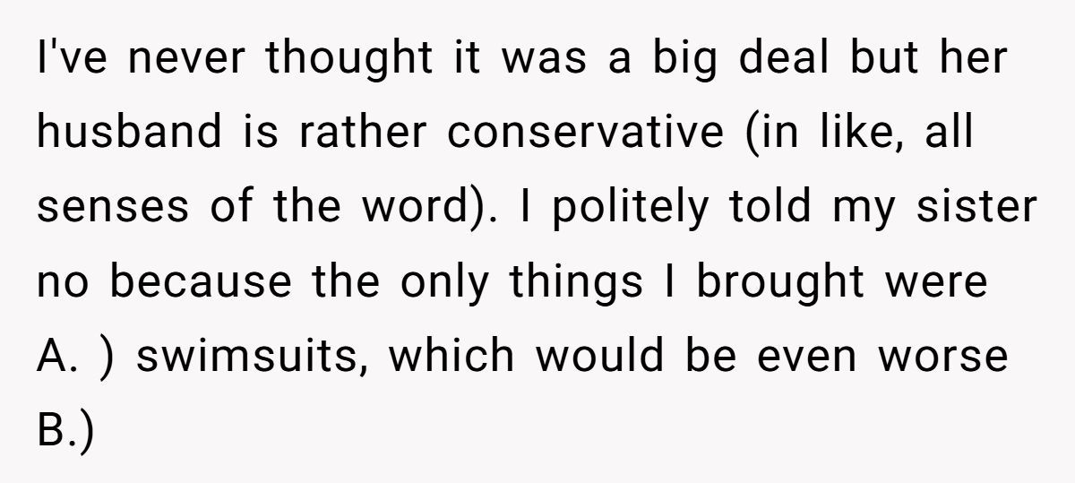The woman, let’s call her Mia, had come to the lake house expecting family bonding and quiet mornings. But she didn’t anticipate the silent judgment of her brother-in-law… or her sister’s sudden obsession with “modesty.”