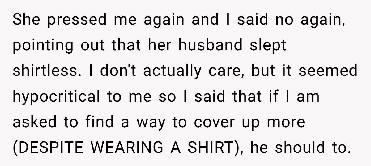 She pointed out, rightly, that her brother-in-law was sleeping shirtless. If modesty was the issue, shouldn’t it go both ways?