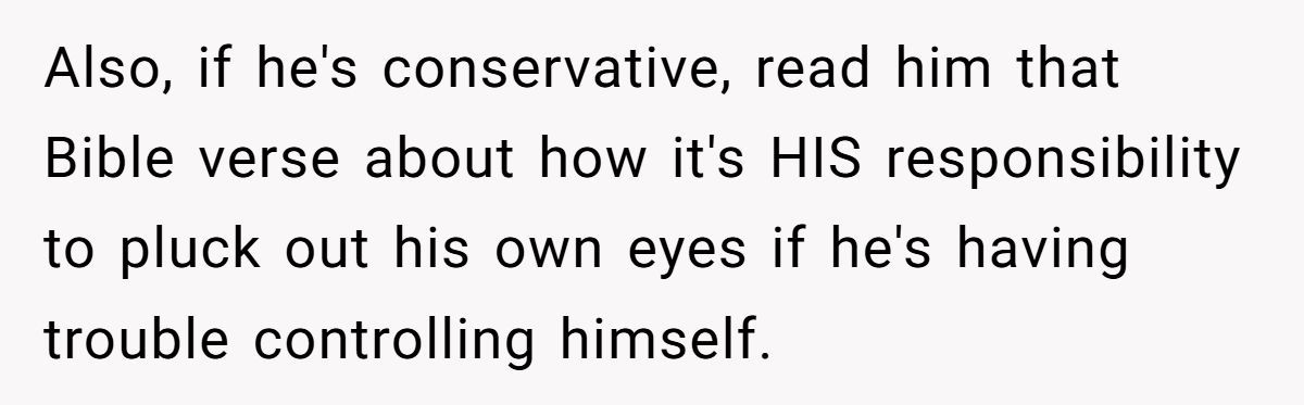To Mia, it was a big deal. Why should she endure physical discomfort—tight straps, constriction, heat—just to placate someone else’s wandering thoughts? And why was she being asked to change, not the man who apparently couldn’t control his gaze?
