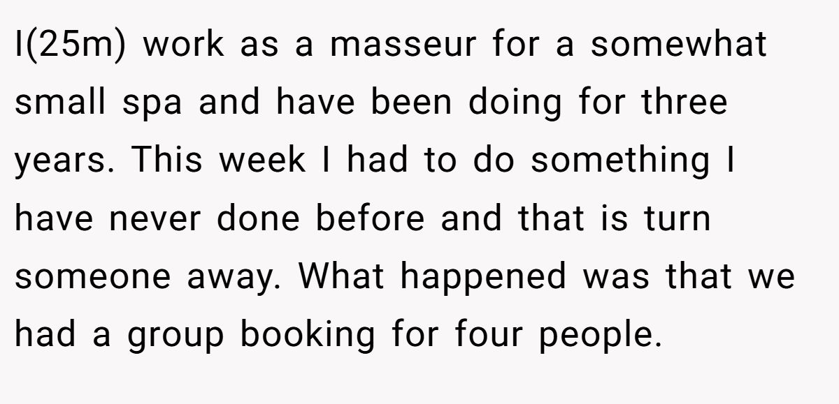 Imagine showing up for a relaxing spa day with friends, only to be told you’re too heavy for the massage table—and then the whole group leaves. That’s exactly what happened when one masseur had to make a difficult call between spa safety and client feelings. According to his Reddit post, he’s now being villainized by his coworkers, and the internet has thoughts. Lots of them.