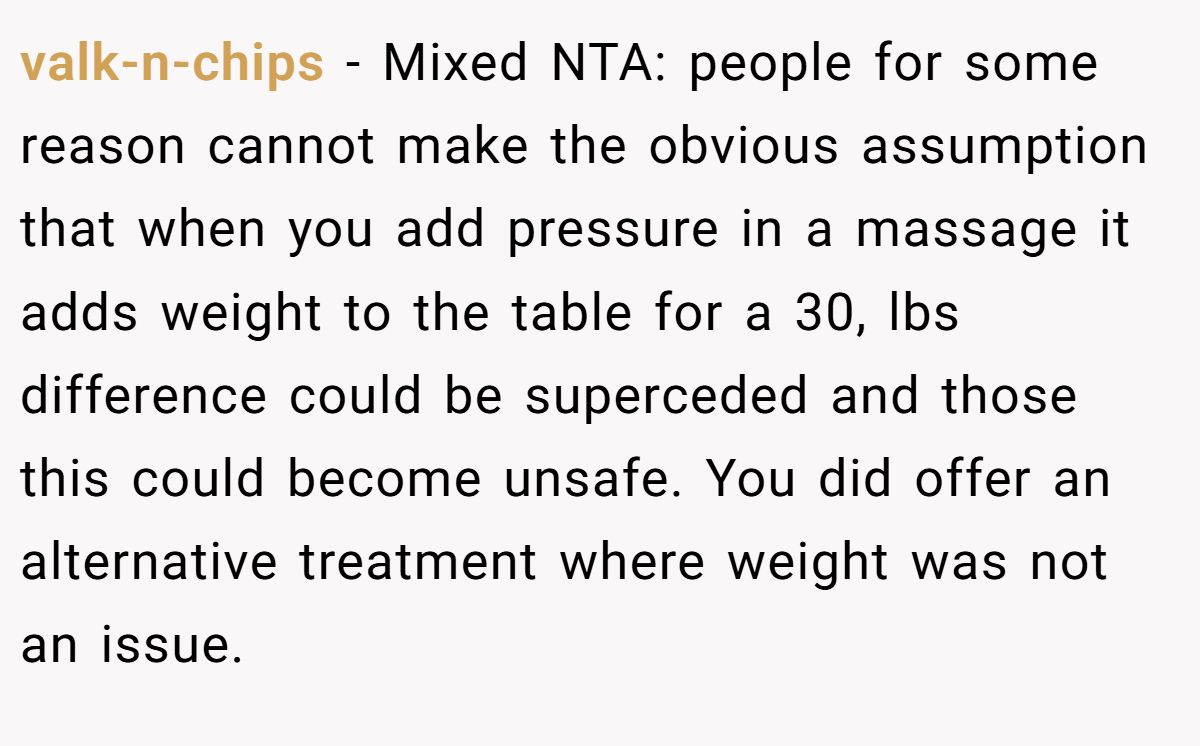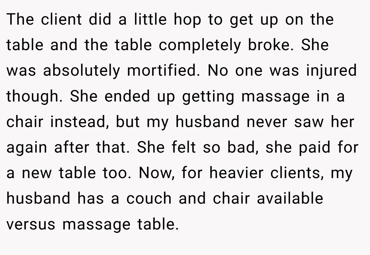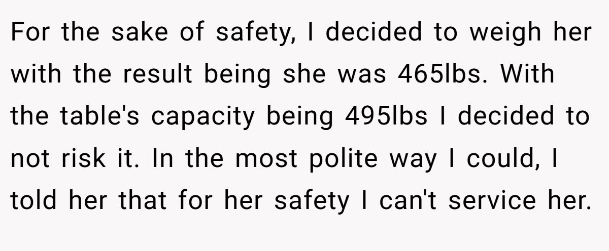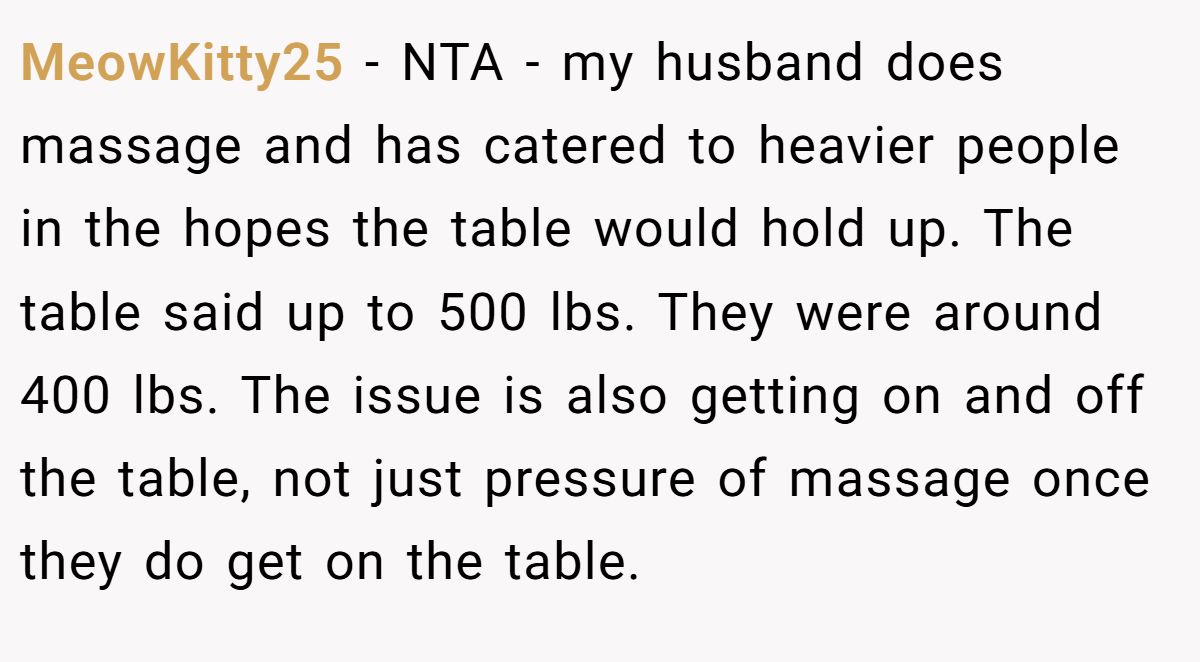 Handling client care in physical wellness settings often requires a balance of safety, compassion, and tact. In this scenario, the masseur faced a very real logistical issue: a weight limit that, if exceeded, could cause serious injury or damage—not just embarrassment. As many commenters pointed out, applying pressure during a massage increases strain on the table. It’s not just about the person’s static weight; it’s the dynamic force of the session itself.